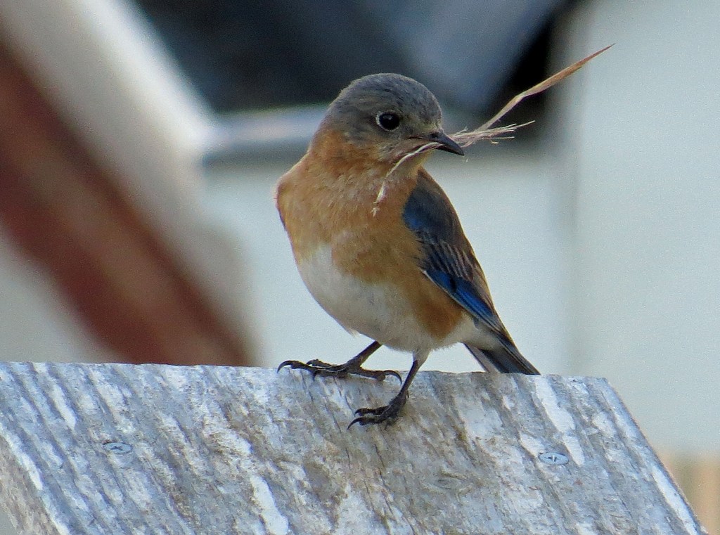 With bluebirds, the male locates the nesting cavity and then tries to entice the female to join him. He provides a few twigs or a bit of dried grass for nesting material, and then perches at the site and flutters his wings to get her attention. The female then does the rest of the building herself. Hmmm…no comment on that arrangement!