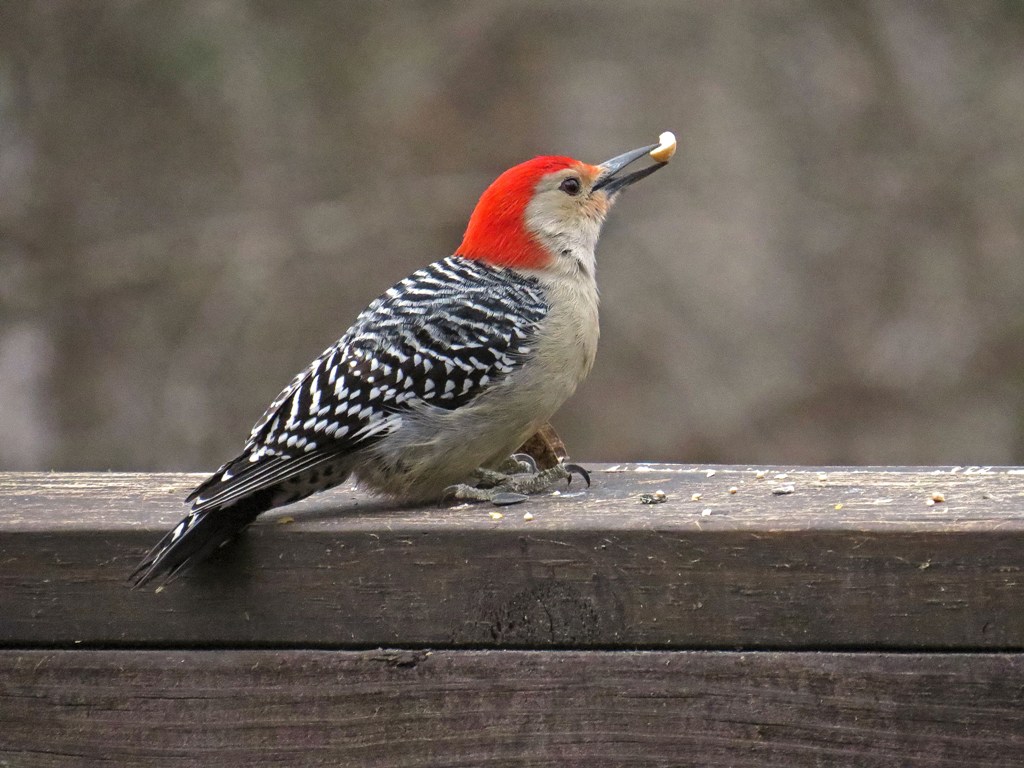A couple of cool tidbits about Red-bellied Woodpeckers. Like other woodpeckers, they have two front toes and two back toes, which makes it easier for them to climb tree trunks. (Songbirds have three front toes and one back toe to make it easier for them to grasp branches when they are perching.) They also have sharp pointy beaks they use to poke and pry into the crevices of bark, and long sticky tongues to capture the insects they find there.