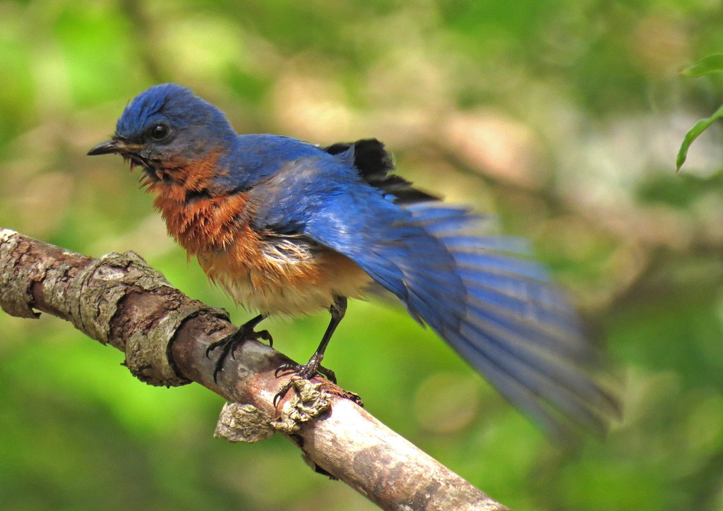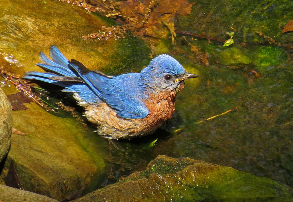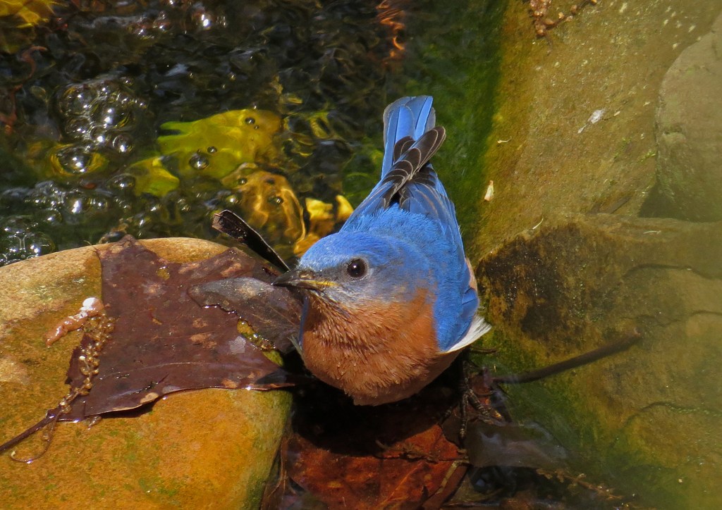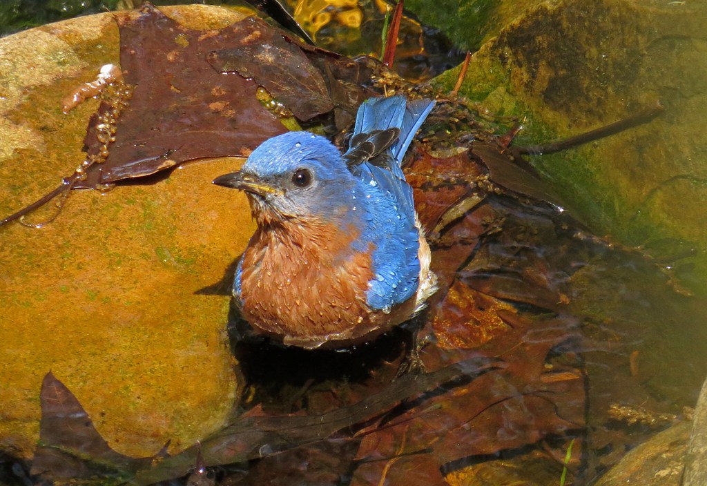 The waterfall has been such a blessing. Not only is it beautiful background music to my ears, but it also lures a lot of birds to my backyard. Like this lovely bluebird who enjoyed a leisurely bath, sunned himself on a branch, and then headed back for more.