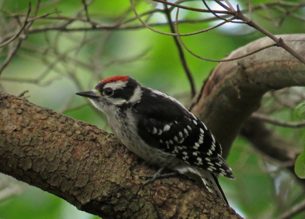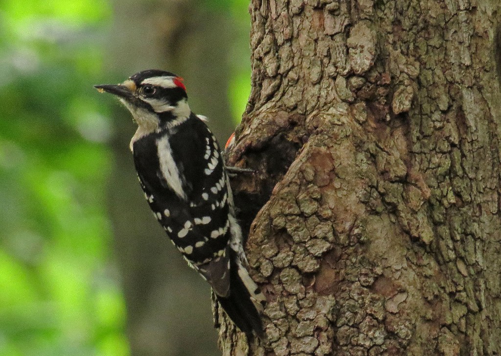So, how can you tell that Corte`s is a youngster? Well besides the lack of coordination you would notice if you could see him in action and the bit of remaining baby fuzz, the immature male downy has a red cap on the top of his head whereas the adult male has a red patch on the back of his head. The female has no red at all. The pictures below show the young downy on one side of the dogwood while his dad searches for peanuts on the other side. The birds know to check out the hollow portion of this tree since I often hide a stash of nuts or sunflower seed in there.