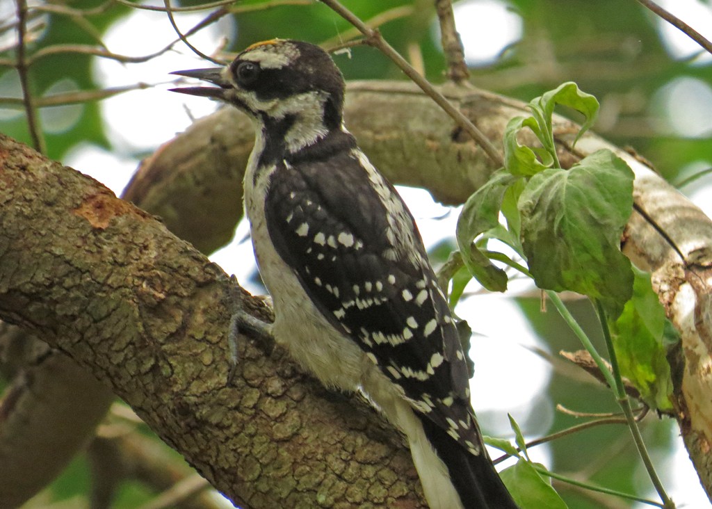 The beak of the Downy is about half the size of its head length, while the Hairy’s beak pretty much matches the length of his head. Another difference is in the tail feathers. The Downy has black spots along the outer tail feathers, while the Hairy’s is solid white. Both of these young males sport colorful caps (in this case the Hairy’s is rusty orange, but is is usually red) that will be traded in for red patches on the backs of their heads as they approach adulthood. It is easy to see why many people never realize they are looking at two different kinds of birds.