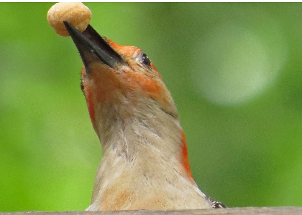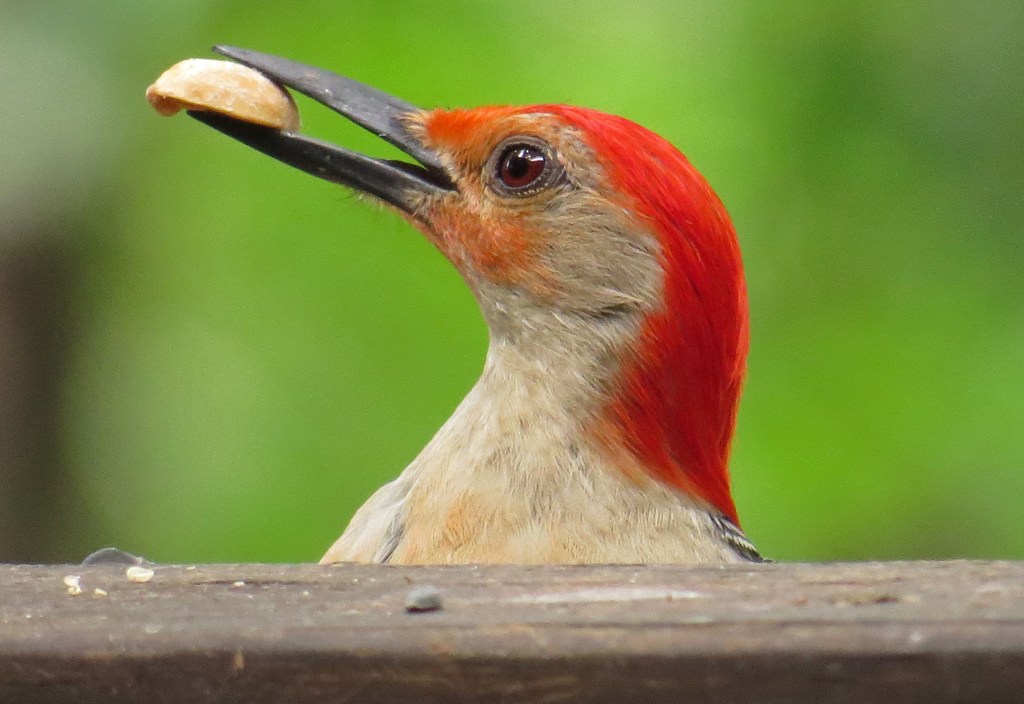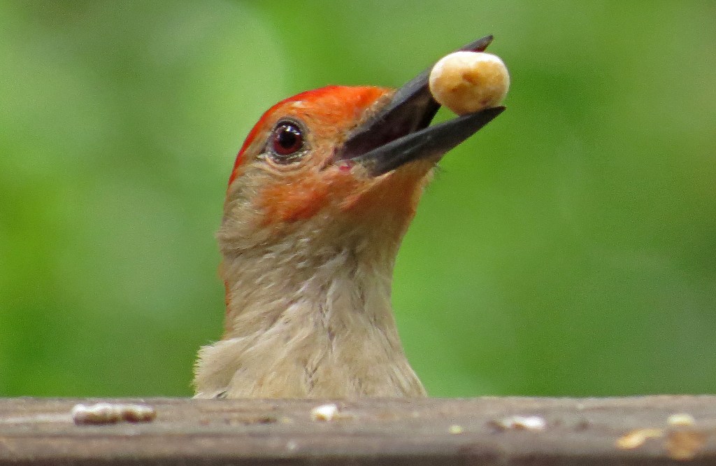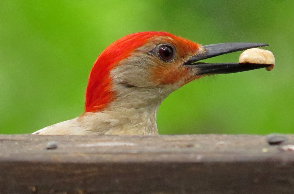 Several days ago I posted a picture of a Red-bellied Woodpecker grabbing a peanut from the feeding trough. Since then, he has shown up on a regular basis, and has perfected his skills in peanut piracy. He surveys the scene from the safety of a nearby tree limb; lands on the backside of the deck rail; pops his head up over the ledge; then quickly snares a peanut and flies off to gobble it up. He makes one trip after another until he has had his fill of plunder or there is none left to be taken.