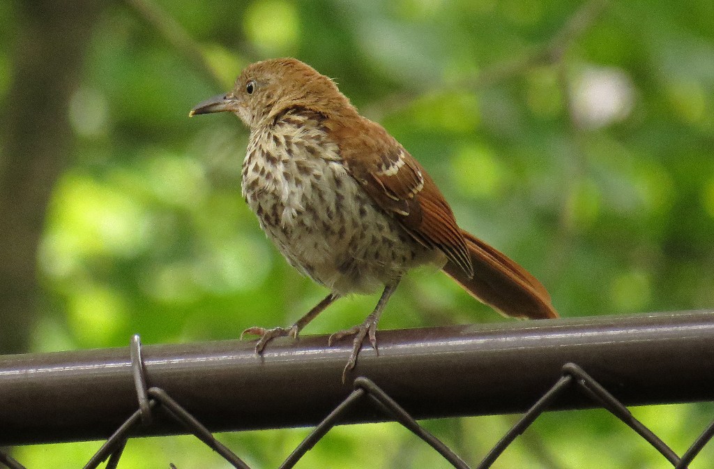 It wasn’t long before a young Brown Thrasher showed up to provide the afternoon’s entertainment. At first he was a rather timid fellow. He landed on top of the fence rail and sat there for quite some time surveying his surroundings. Whenever another bird approached, he would flinch and look a bit intimidated.