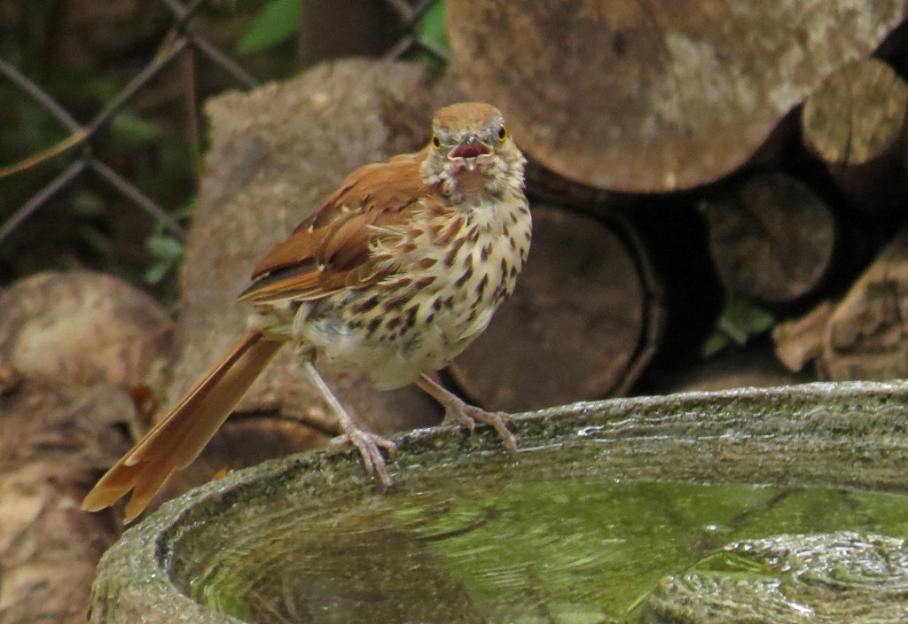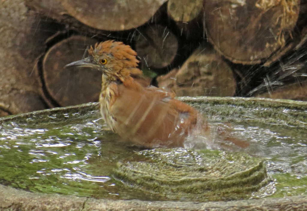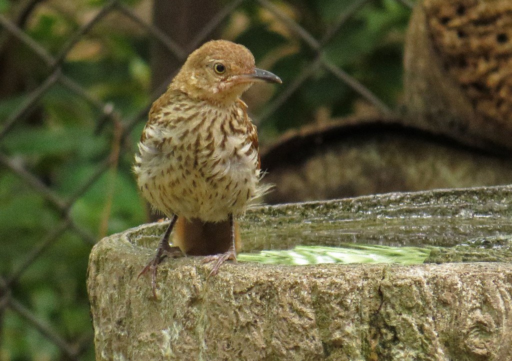 The young thrasher watched from a nearby bush, and must have taken notes because when the towhee left, he returned to the birdbath and this time didn’t settle for just a sip of water. He splashed about with great gusto, clearly enjoying himself. He was quite comical to watch.