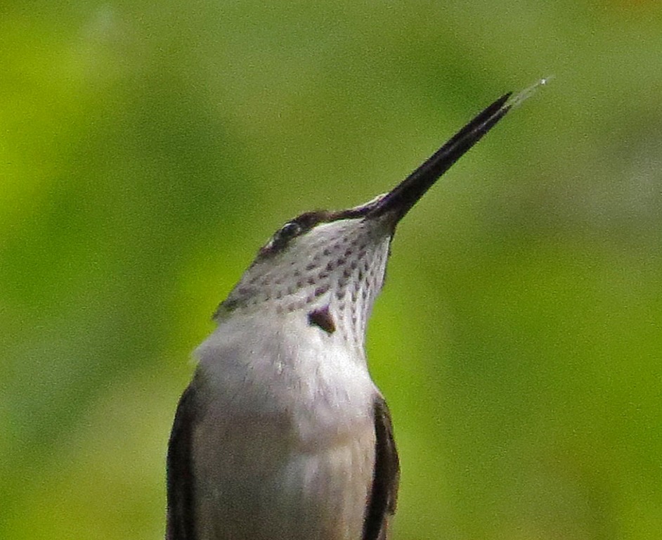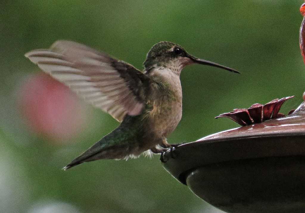 Although they are able to grip a branch, hummingbirds have weak feet. They rarely walk or hop, choosing instead to fly from one place to the next. If you look carefully at the picture below, you can see his clear tongue. I think he is getting a small water droplet from the mister that I had spraying.