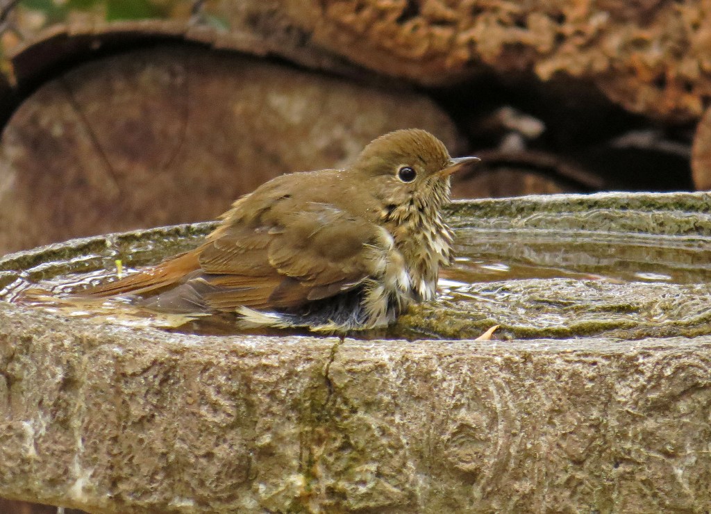 One bird that showed up was the Hermit Thrush. Normally he is a bit skittish, but yesterday he was quite the boisterous bather. He did not seem the least bit intimidated by my presence, which earned him the honor of being the bird featured on day six of Splash Week. I just love his rustic, woodsy colors.