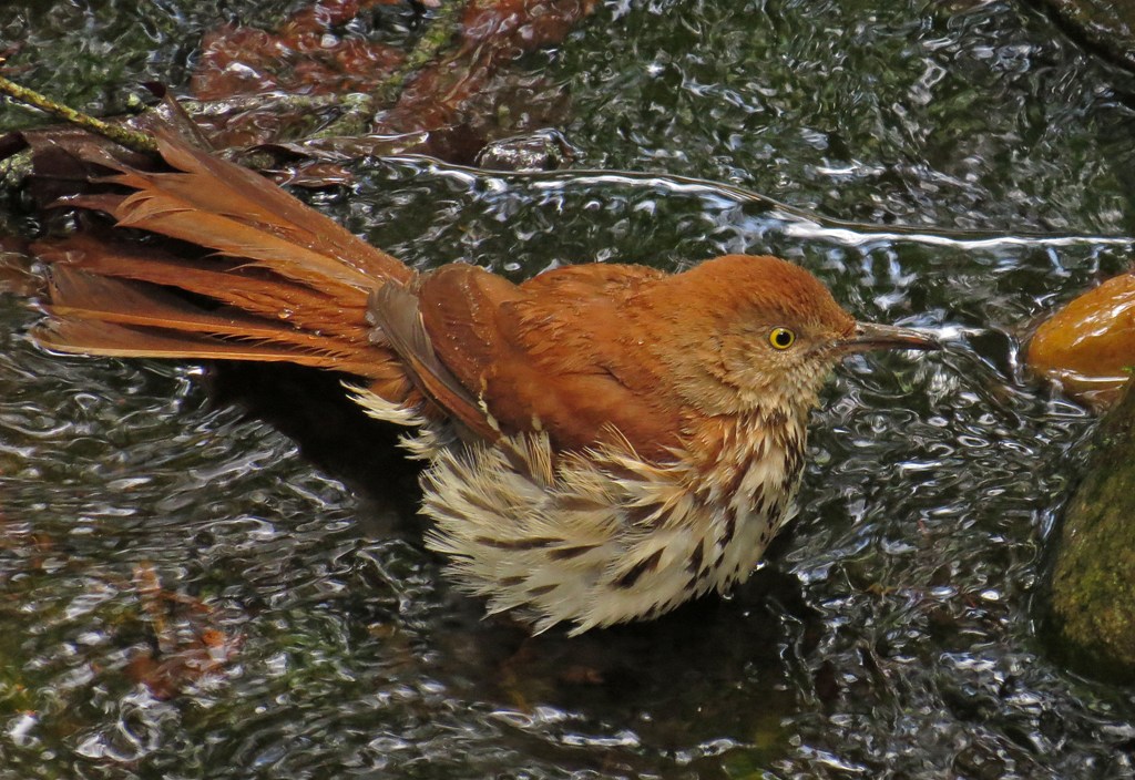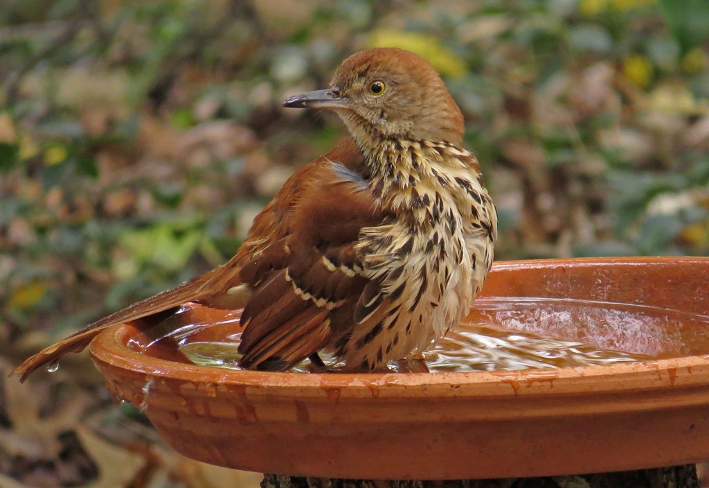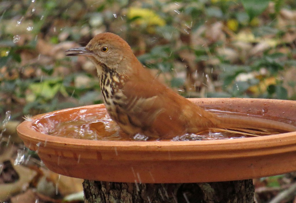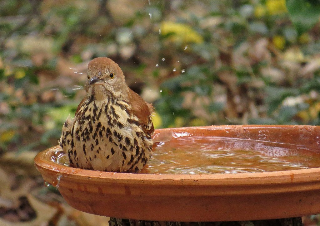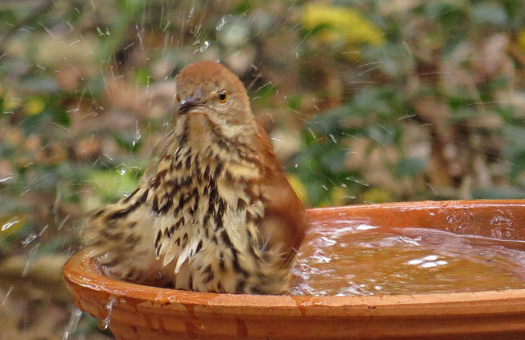 I can’t believe it’s the last day of Splash Week. We’ll wrap things up with the Brown Thrasher, the state bird here in Georgia. This fellow does not seem at all particular about where he bathes. I have pictures of him in the fountain…