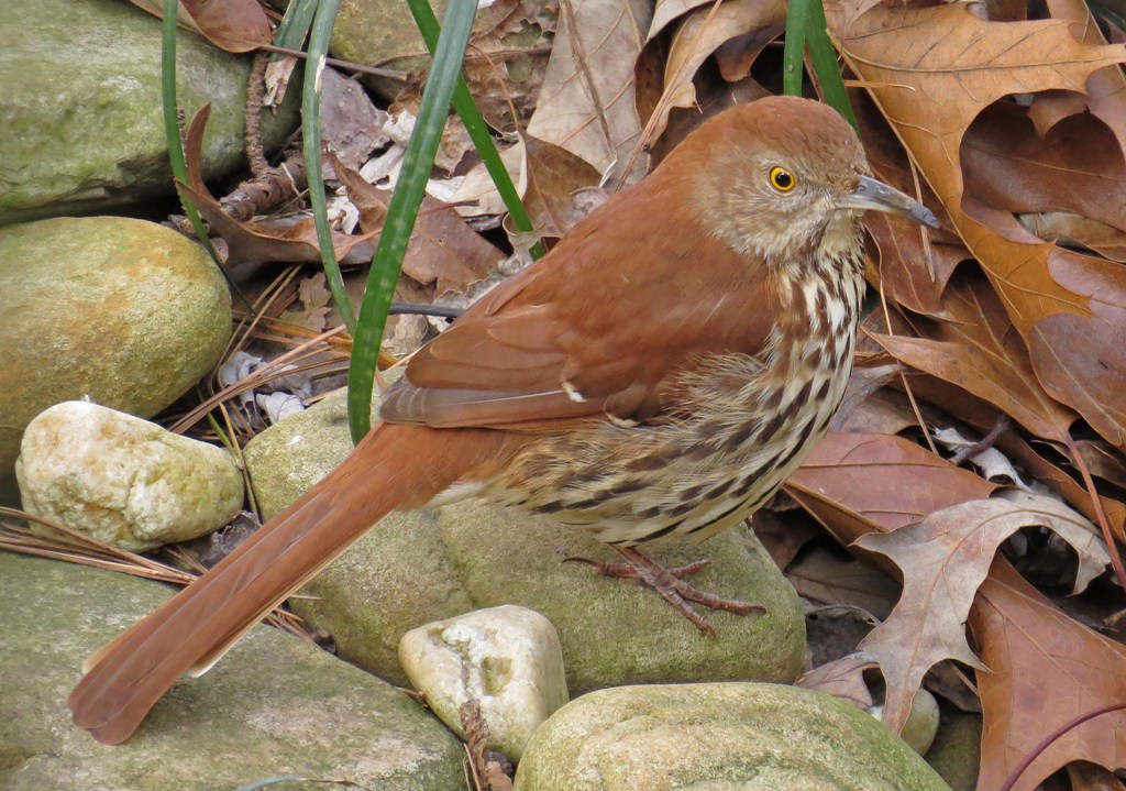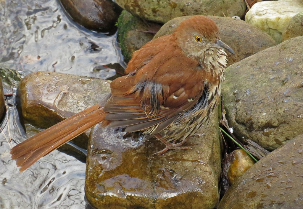 With his hunger satisfied and his thirst quenched, he flew over to the fountain and stood on a rock along the side of the water. I think a good title for the Brown Thrasher would be “the bird who is of the order of the perpetually dirty beak.”