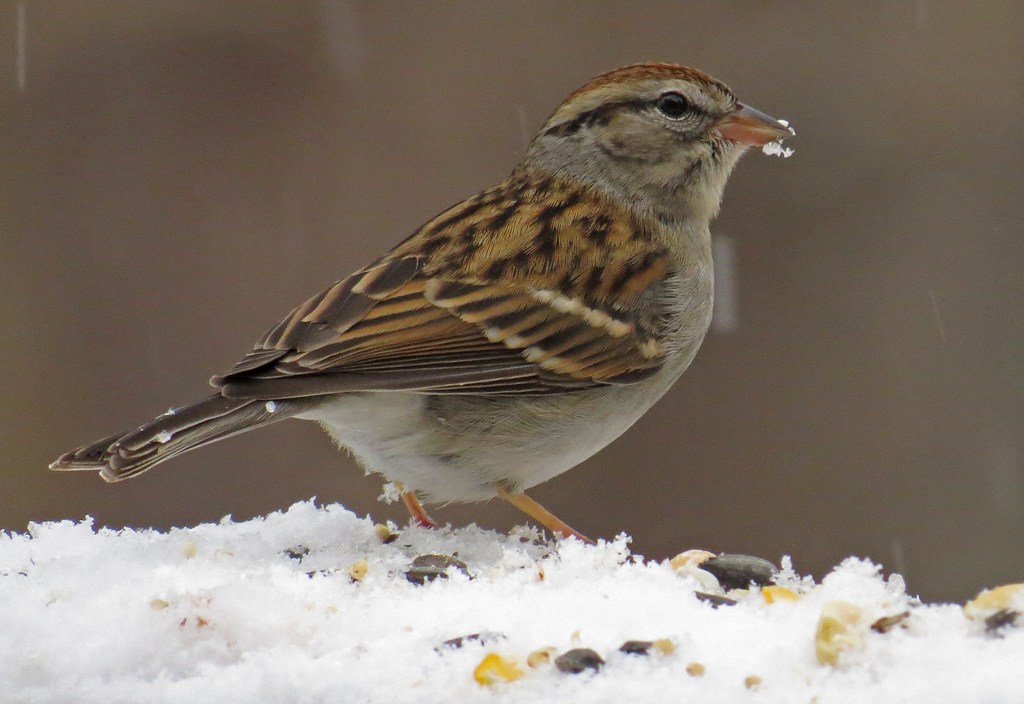 The backyard was quite a flurry this morning – of birds and of snow! Now you northerners might laugh, but this inch or so of white stuff was big news in these parts.
