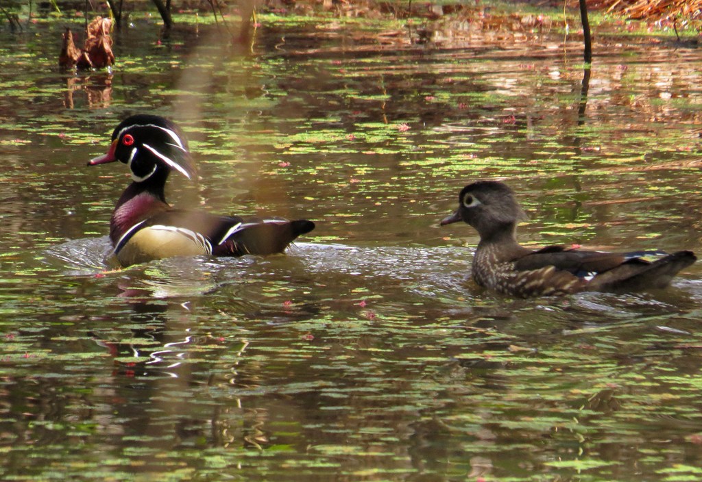 A pair of Wood Ducks was also at the pond. They were moving quickly, and to get a picture of them I had to dart beyond the “Staff Only” barrier. No worries though. My clever hubby quickly handed me a stick and said, “Here is your staff!”