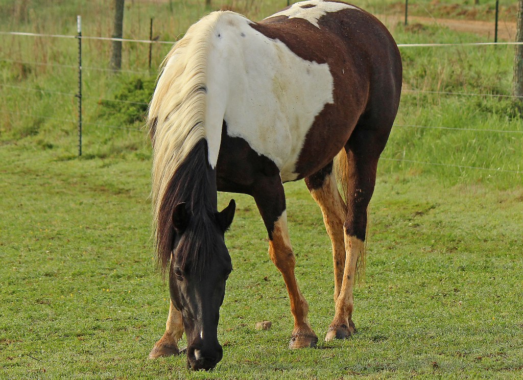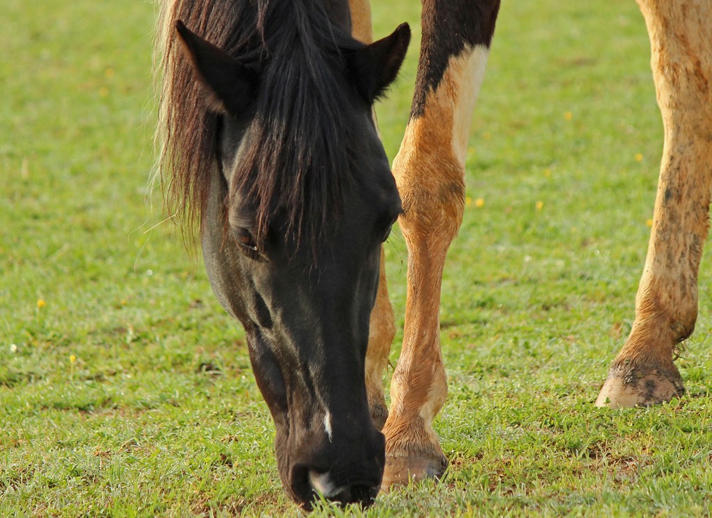 …while his companion (I didn’t check the gender, but I’m going to go ahead and say female because her mane was to die for!) was content to graze in the damp grass.