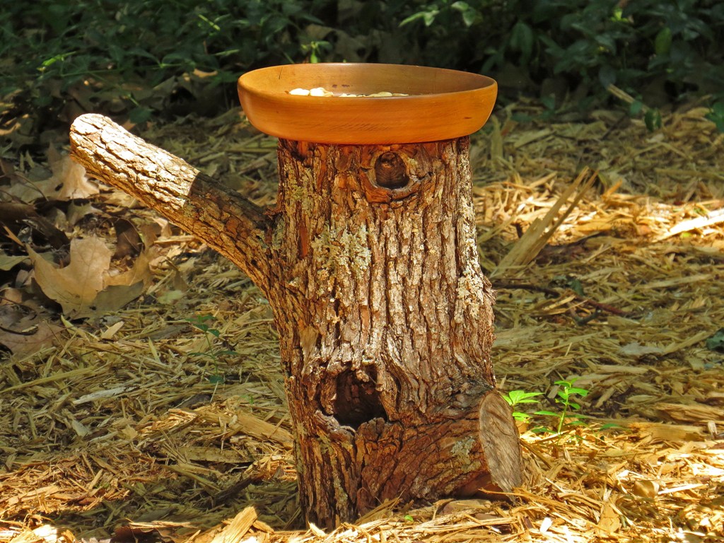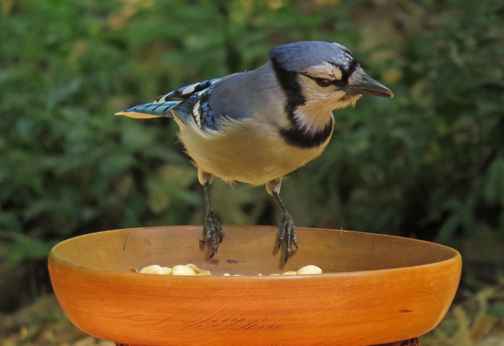 This afternoon, I put a handful of peanuts in a wooden dish, and then set the dish on a log stand in the backyard. Voila…Blue Jay bait!