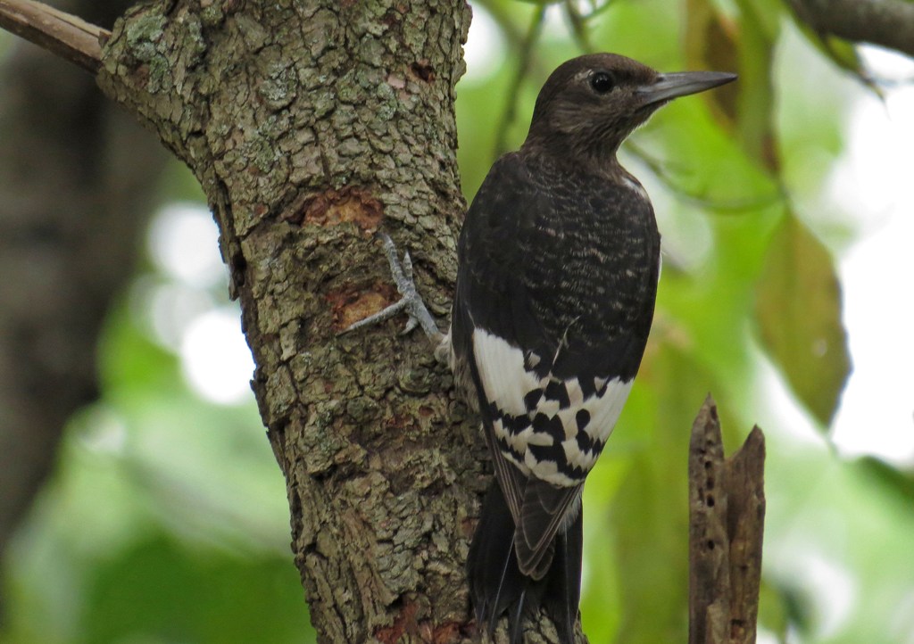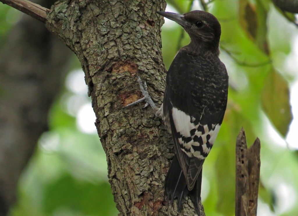 As I was watching the antics of this threesome, a movement in the center of the yard caught my eye and I looked up to see this juvenile Red-headed Woodpecker perched on the side of a tree.