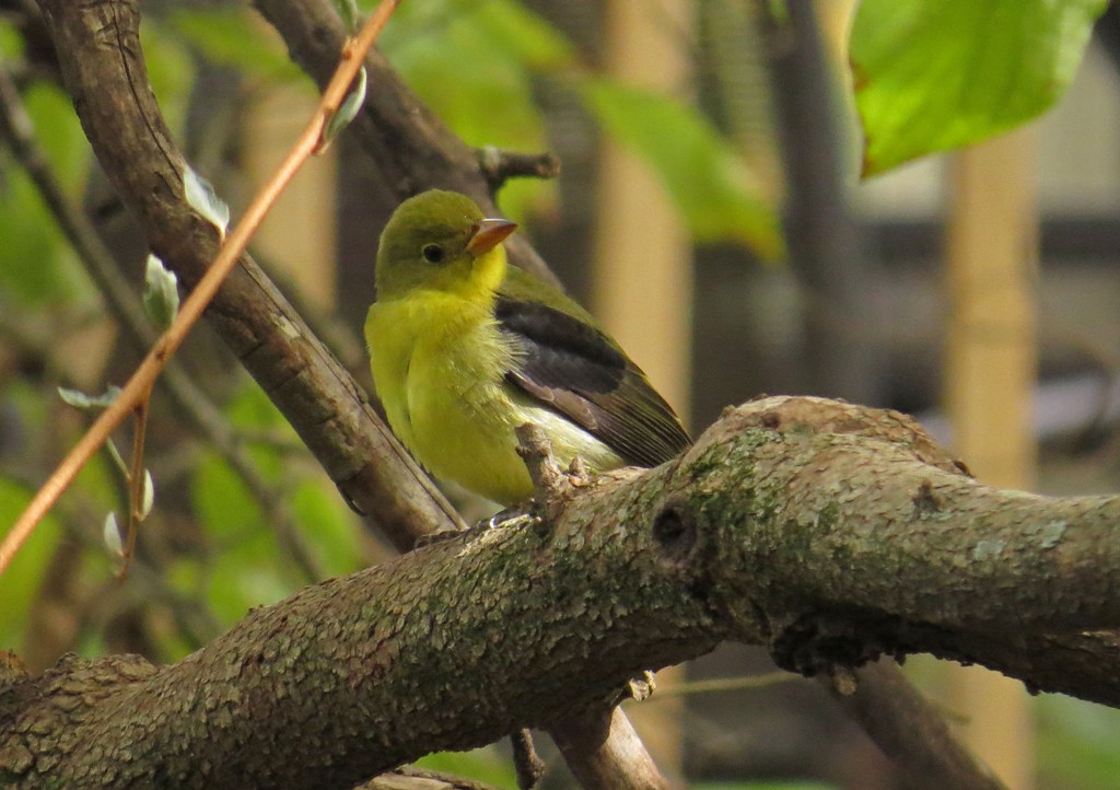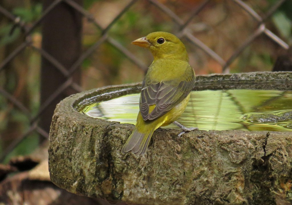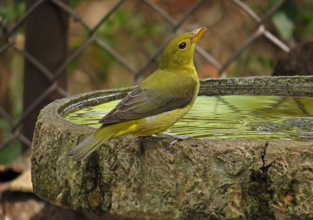 A blur of yellow caught my eye when I went outside to refresh the birdbath and the water dishes this afternoon. At first I thought it was a Warbler; turns out it was a female Scarlet Tanager stopping by for a drink.