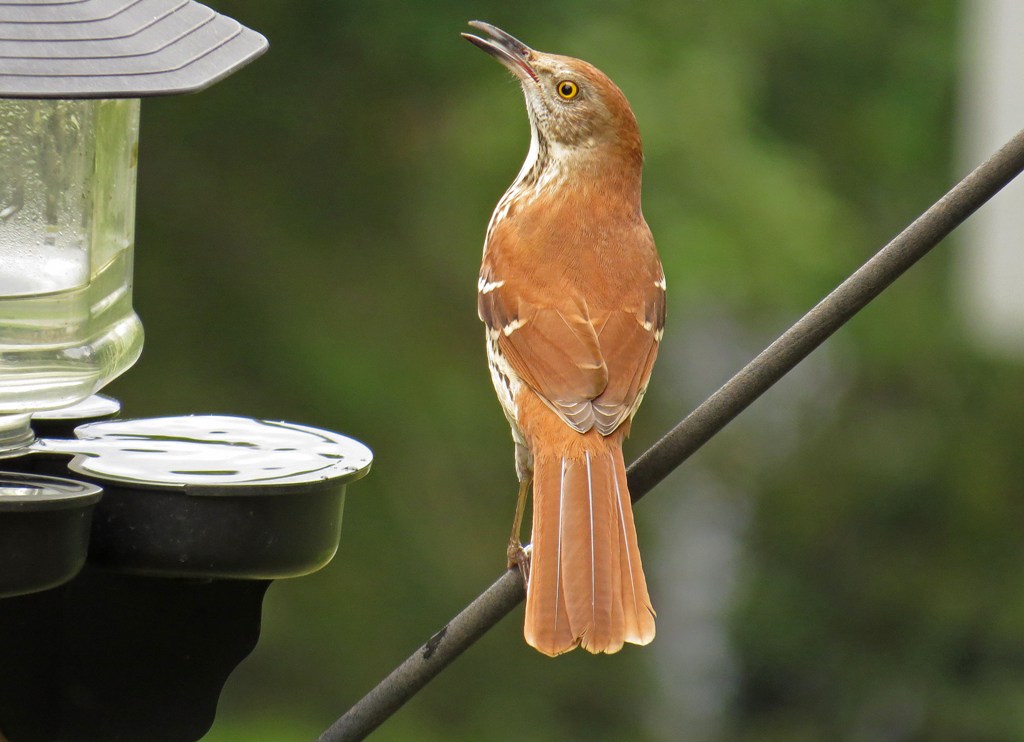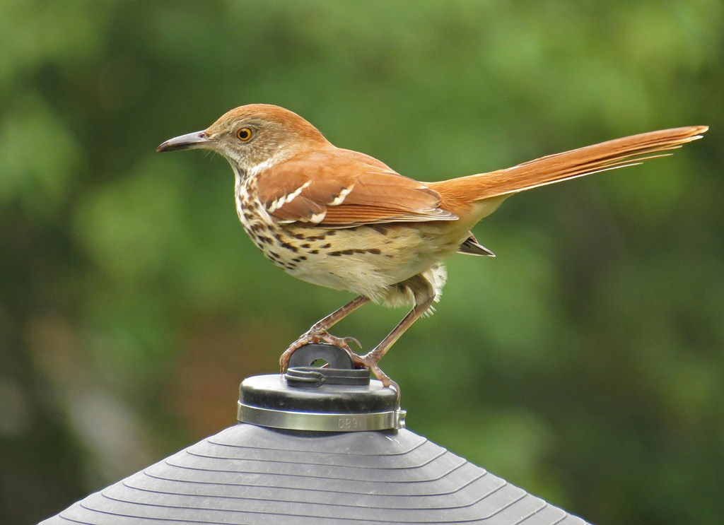 The first to arrive was a Brown Thrasher. He helped himself to a drink, and then perched on top of the lantern to give the yard a good glance.