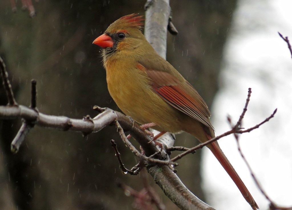This male Cardinal gobbled up seed while his female counterpart watched from the nearby branches.