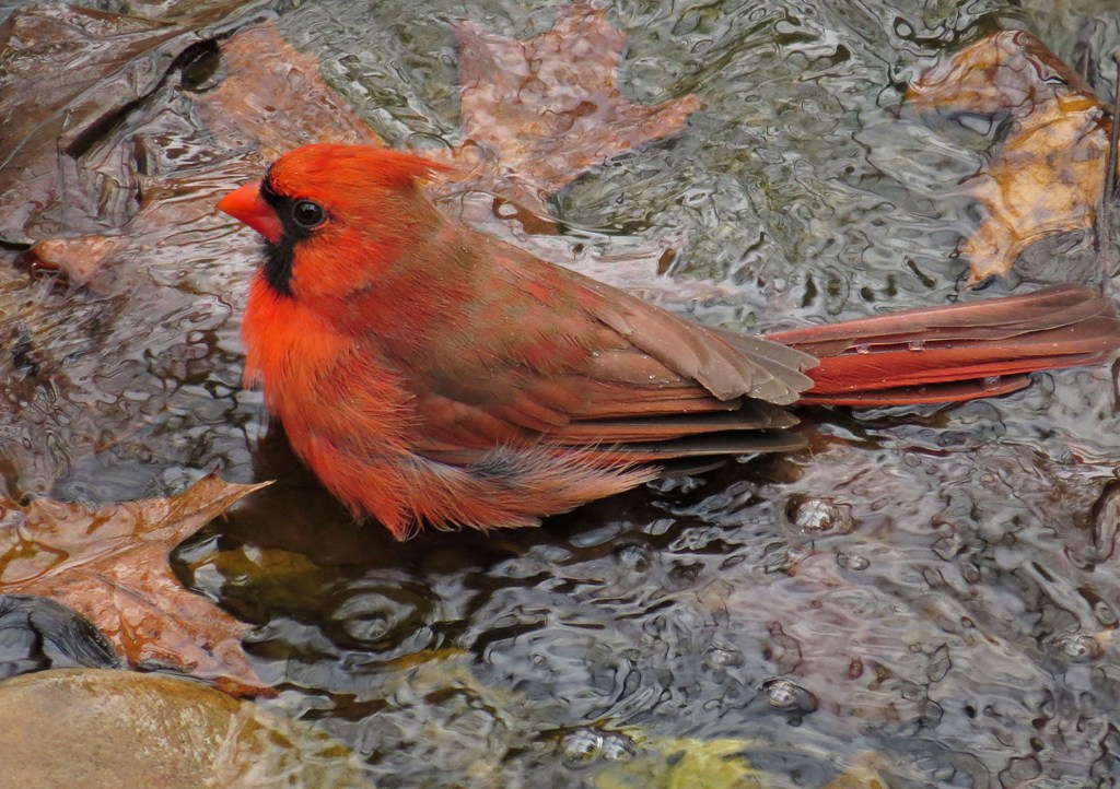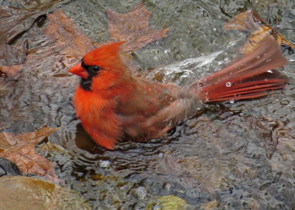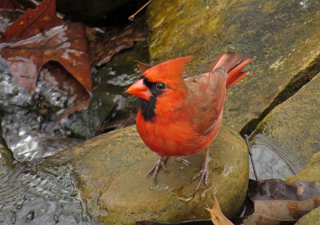 But my favorite Saturday bath-taker was this male Cardinal. At first, he stood on the rocks by the edge of the fountain, carefully surveying the area.