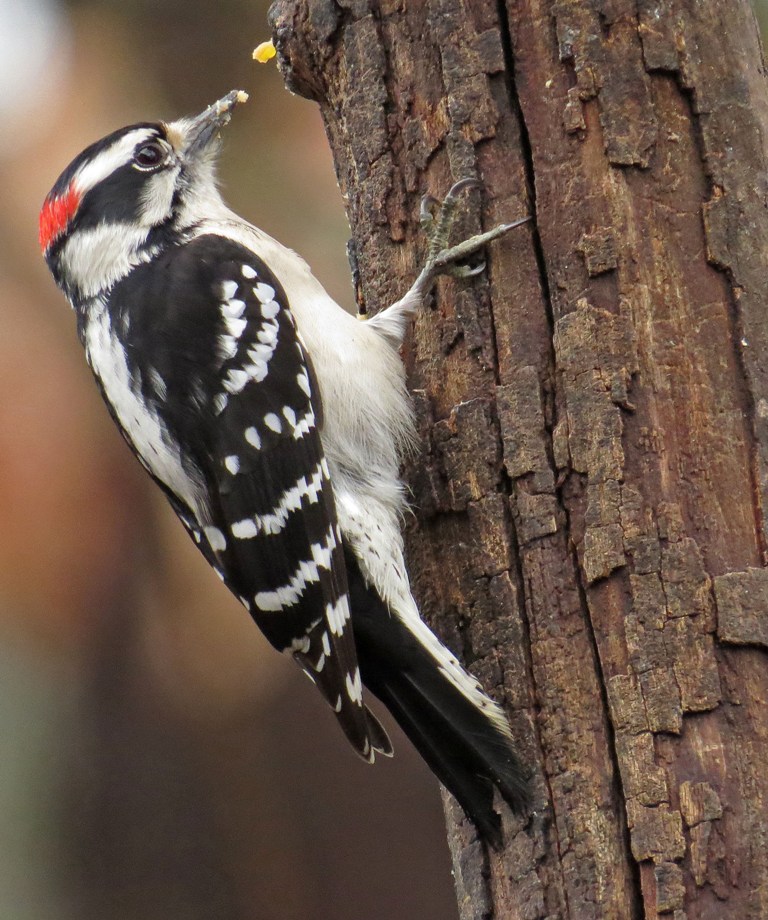 This past weekend, I decided to prop up one of the limbs vertically. In no time at all, the Woodpeckers had discovered this new landing spot and were pecking away at the bark butter smeared on the backside.