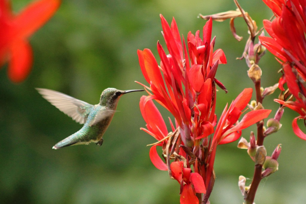We have a couple hummingbird feeders, but they tend to not visit them as much until the flowers fade away a bit.