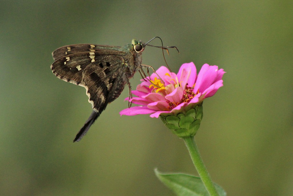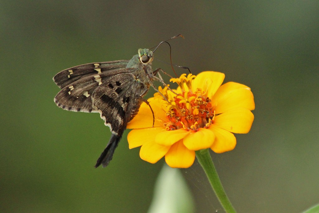 I’m used to seeing Fiery Skippers and Silver-spotted Skippers darting and dipping about in the front yard, but today was the first time I saw a Long-tailed Skipper sipping nectar from the Zinnias.