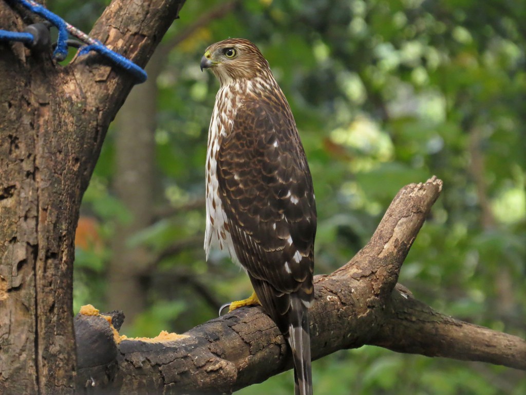 I think this might be a juvenile Coopers Hawk, which are fond of eating birds. I can see why that perch on your backyard might be attractive to a bird hunter!