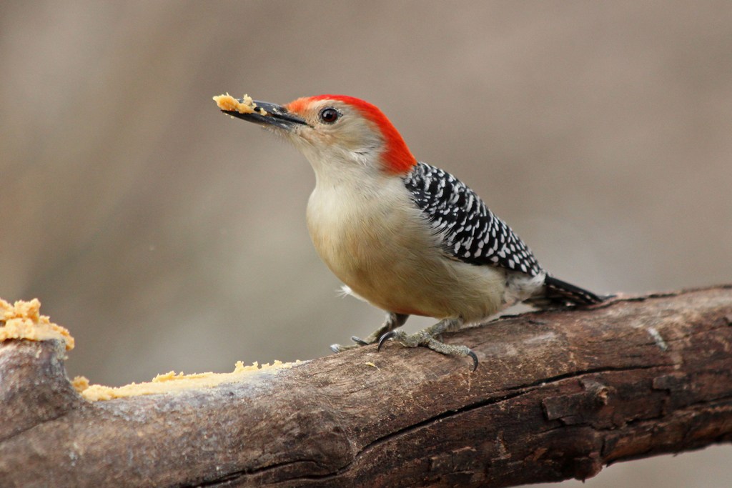 Interesting observation, Kathy. The southern look-alike (and probably close relative) Golden-fronted Woodpecker is a peanut butter-suet fan too, and is aggressive enough to maintain control of its distribution quite well. What do you know, I found a paper showing hybridization of these two species where their ranges overlap in Oklahoma or eastern Texas. So they really are close relatives.