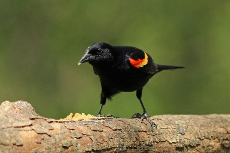 As soon as the Red-bellied fellow flew off, a Red-winged Blackbird landed with both colors of his wing patches on full display – clearly conveying his dominance.