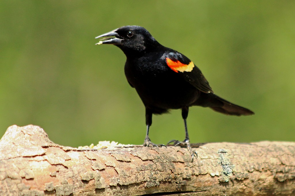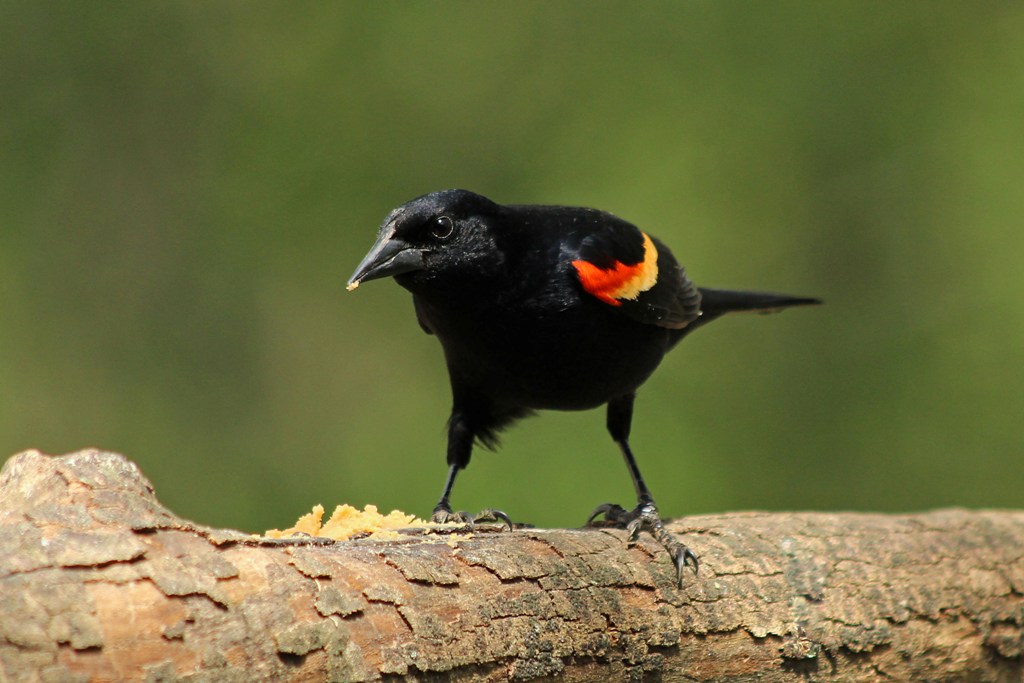 As soon as the Red-bellied fellow flew off, a Red-winged Blackbird landed with both colors of his wing patches on full display – clearly conveying his dominance.