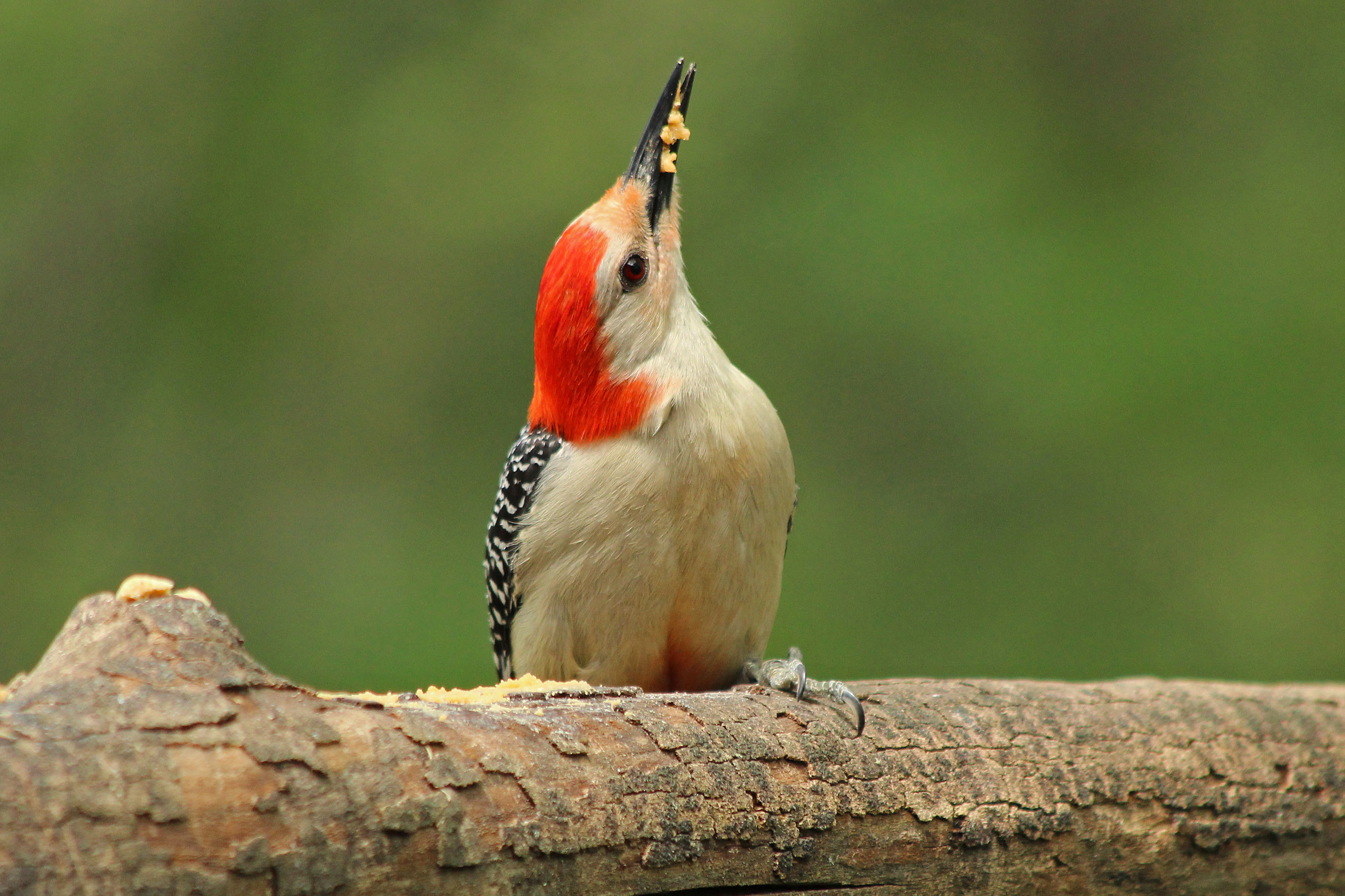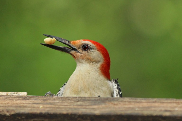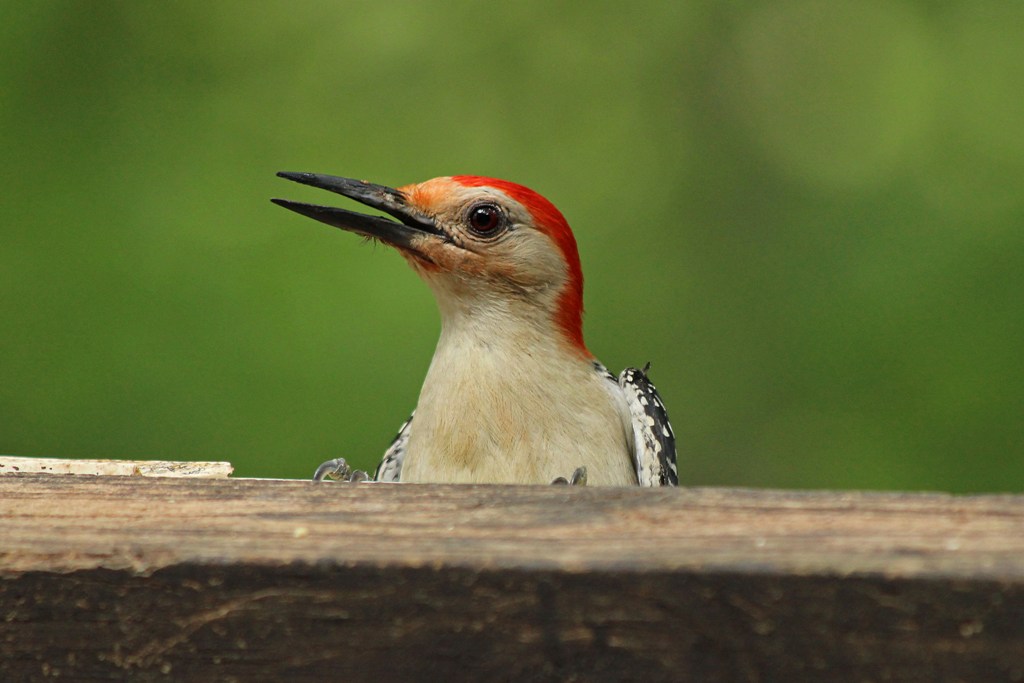 I do have to hand it to the Red-bellied bird (kind of funny name since his belly has only a hint of red!) as he has taken to trying a different tactic. Now he pops his head over the deck rail and quickly grabs a peanut. Perhaps he thinks it prudent to surrender sole claim to the Bark Butter branch.
