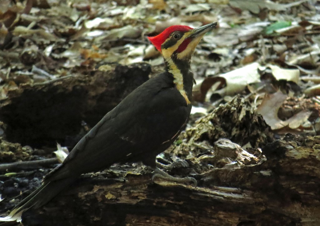 This Pileated Woodpecker popped in this morning. He was on the ground in the backyard, pecking at a rotted tree stump, hoping to find some bugs for breakfast.
