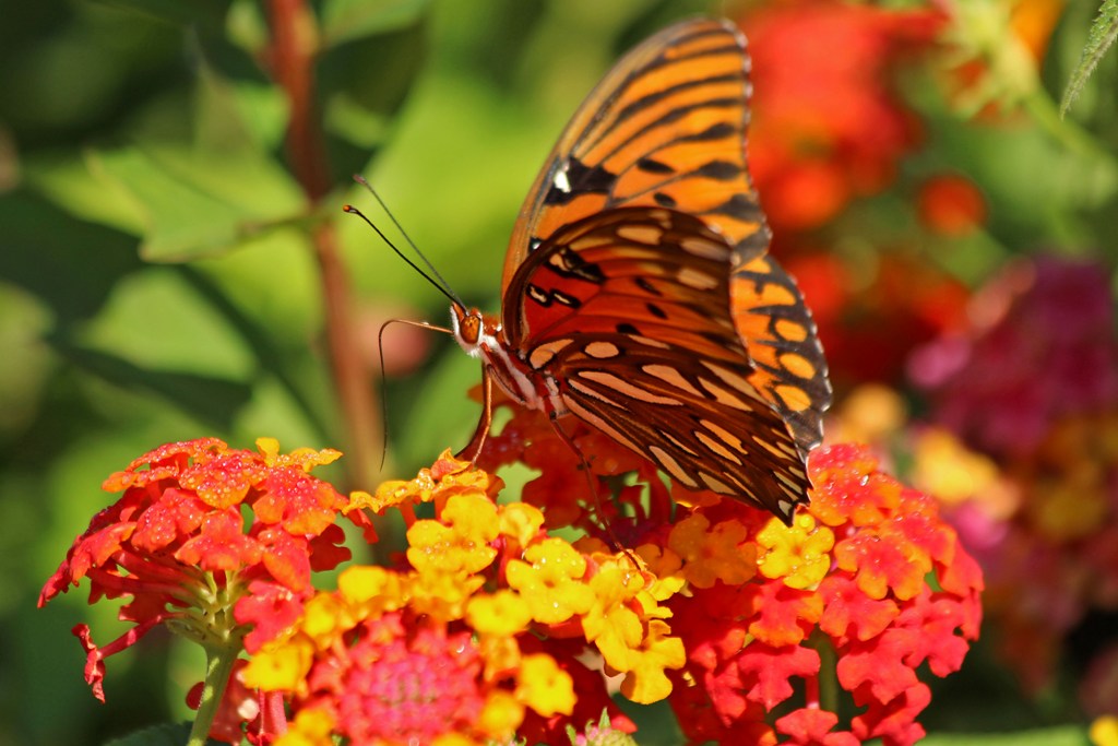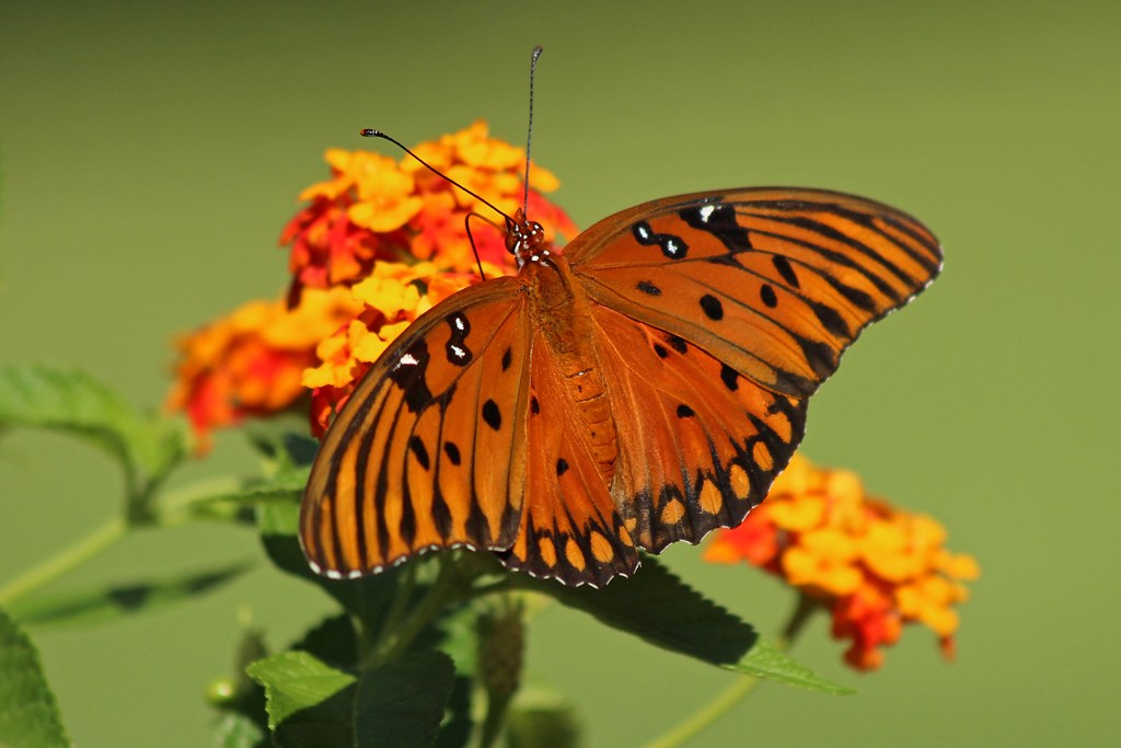 When I was out in the front yard with Tucker this morning (who is now 7 months old) I saw a lovely Gulf Fritillary loitering around the Lantana. This is a butterfly that practically begs to have its picture taken, so I was happy to grab my camera and oblige.