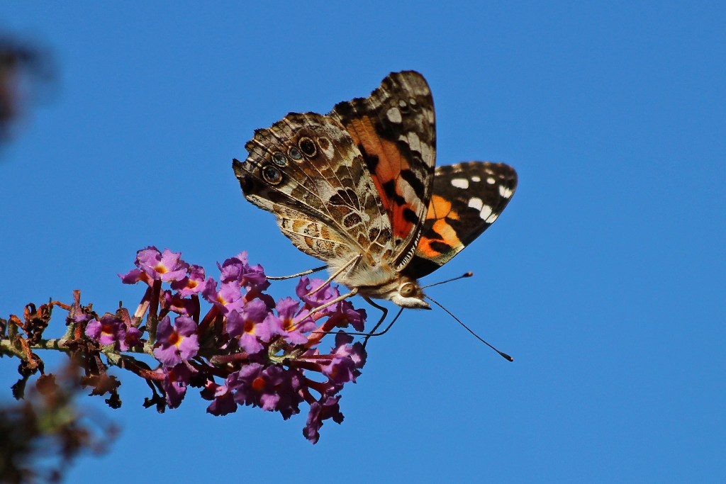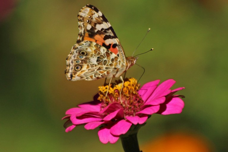 The American Painted Lady was the next to pose. Again, there were several of these splitting their time between the butterfly bush and the zinnias.