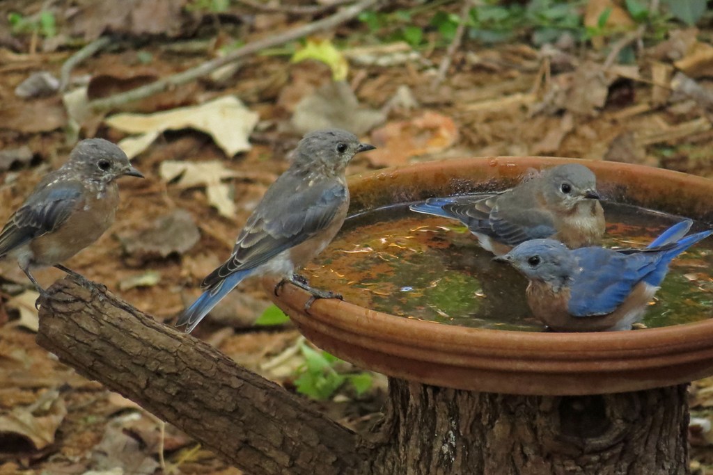 While I was cooking dinner last night (lemon garlic pork loin, baked potatoes, sugar kiss melon, and potato rolls – in case you were curious) I glanced out the kitchen window and saw a boisterous family of Bluebirds at one of the birdbaths. Seeing that there was about 20 minutes left on the oven timer, I scurried to the back deck with my camera and began clicking away.