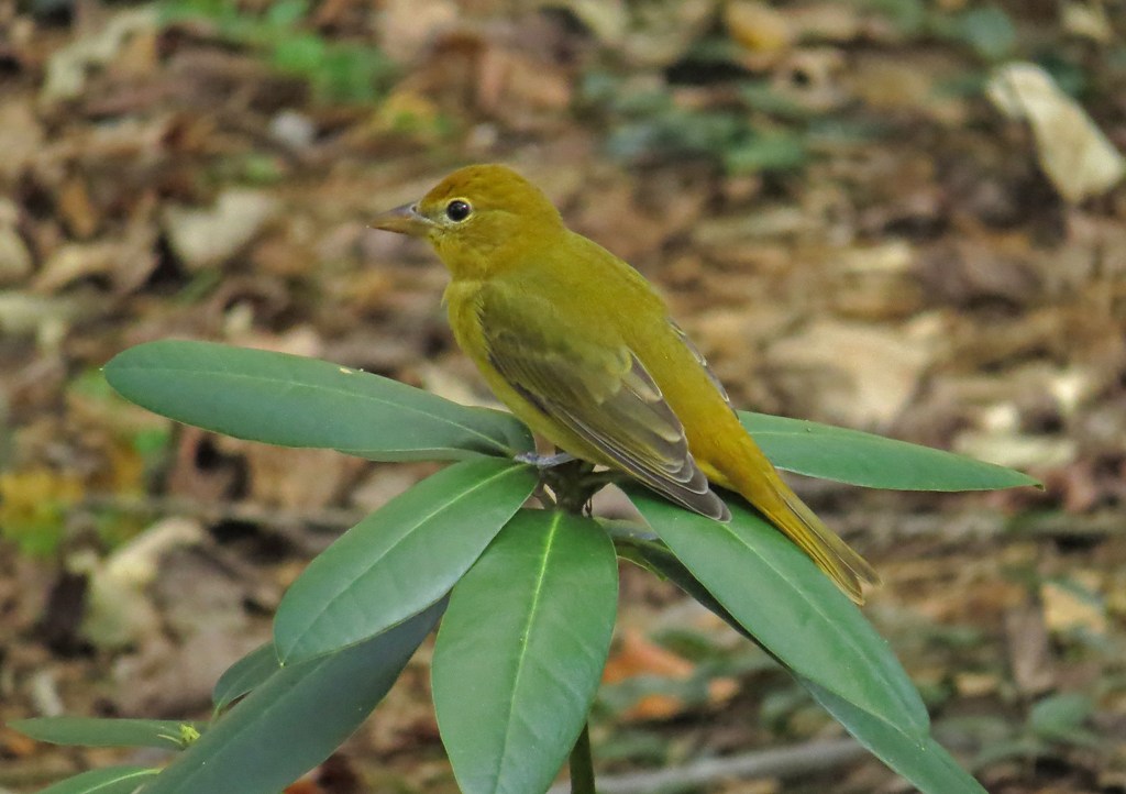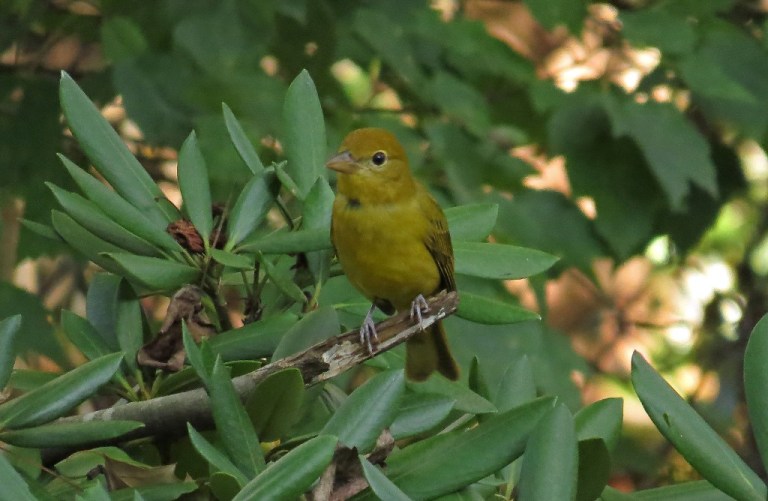 …but her male counterpart, who showed up a few moments later, is a brilliant red during the mating season but becomes an Un-scarlet tanager when fall arrives, choosing bright yellow feathers for his autumn attire.