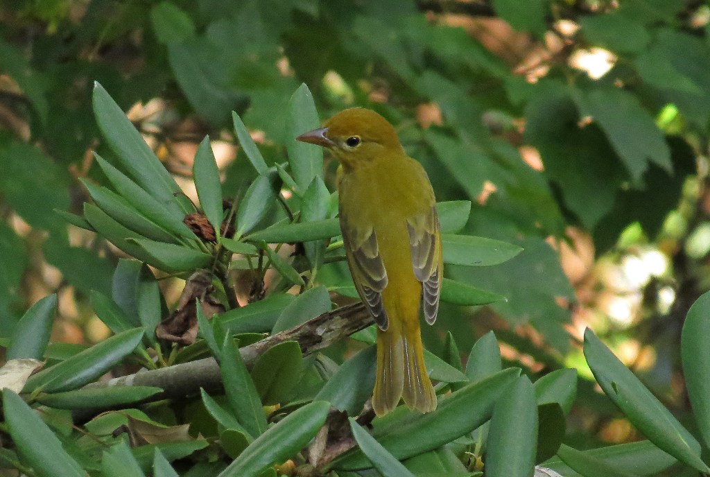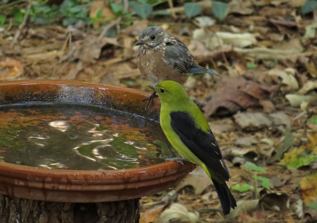 As I watched the family of Bluebirds splashing about, I happened to see a flash of yellow out of the corner of my eye. It was a female Scarlet Tanager patiently waiting for her turn to get a drink.