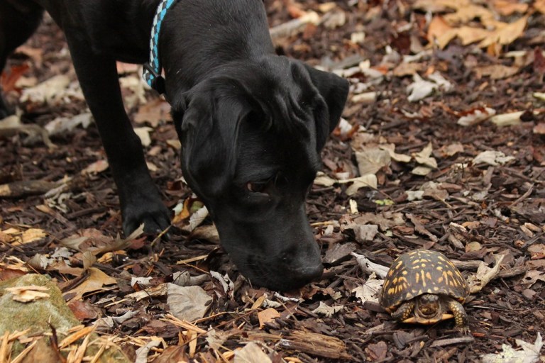 At first I was afraid that the turtle would be seen as a new Tucker toy, but my curious canine was surprisingly gentle. Whenever he did get a little too close for comfort, the turtle did what turtles do and simply retreated into his shell a bit more fully.