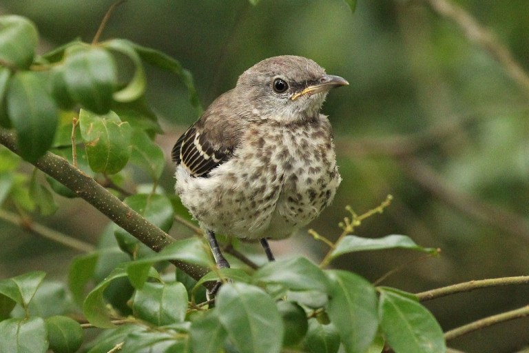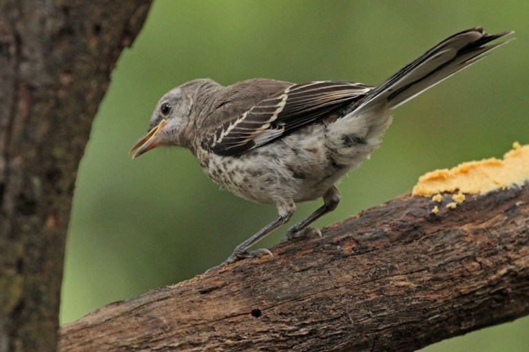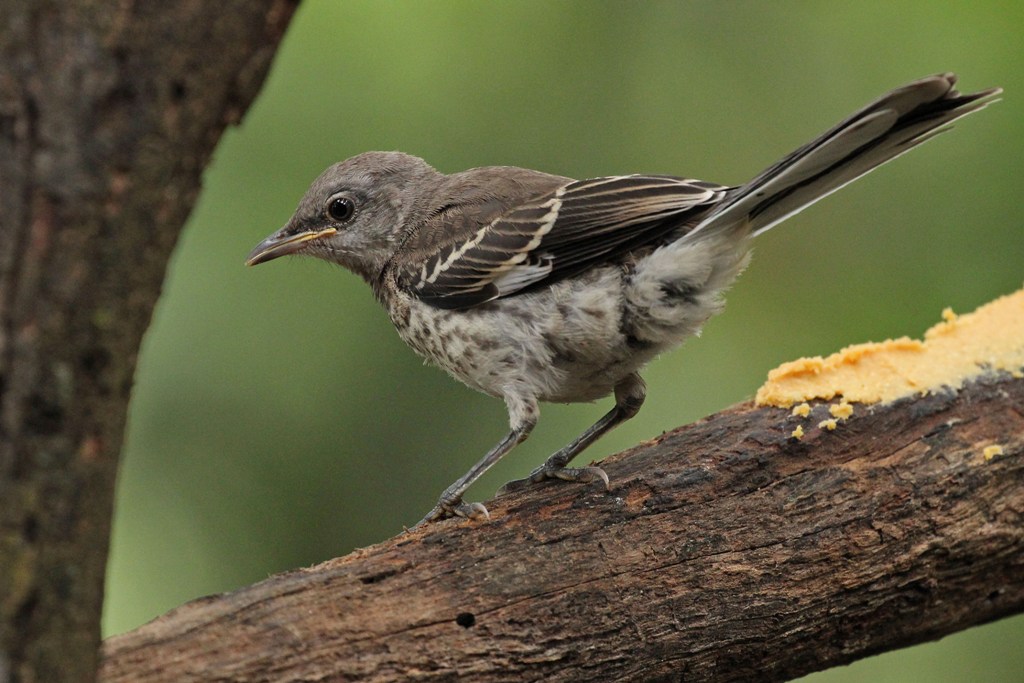 This morning, a young Mockingbird ventured forth without Mom and Dad’s presence (and I think without their permission!) and landed on the Bark Butter Branch.