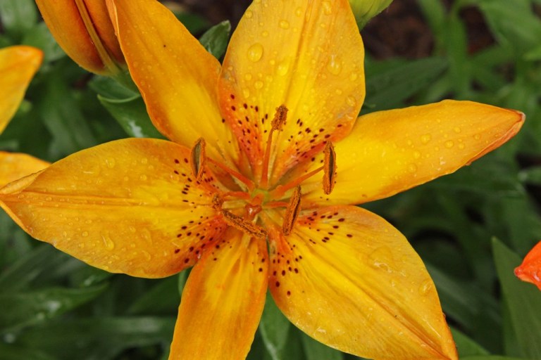 beautiful lilies. flowers are always so pretty when they are rain-drenched. Charlie likes to eat dandelions. This spring when some popped up in the yard, we didn’t need to worry between our granddaughter picking the tops off of the “pretty lello” flowers and Charlie grazing on them!!