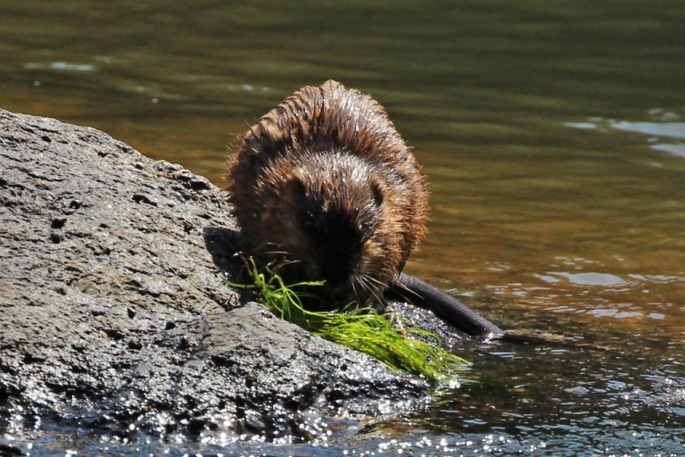 He swam by and then disappeared under the water. A little farther down the trail, I saw that he had re-emerged on a rock in the middle of the river (a bit too far away to get a clear shot) and was happily munching some grass.