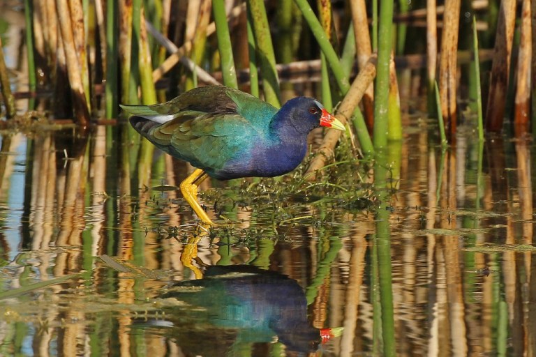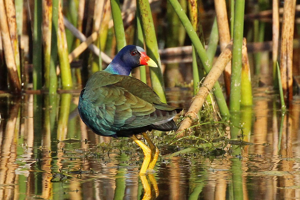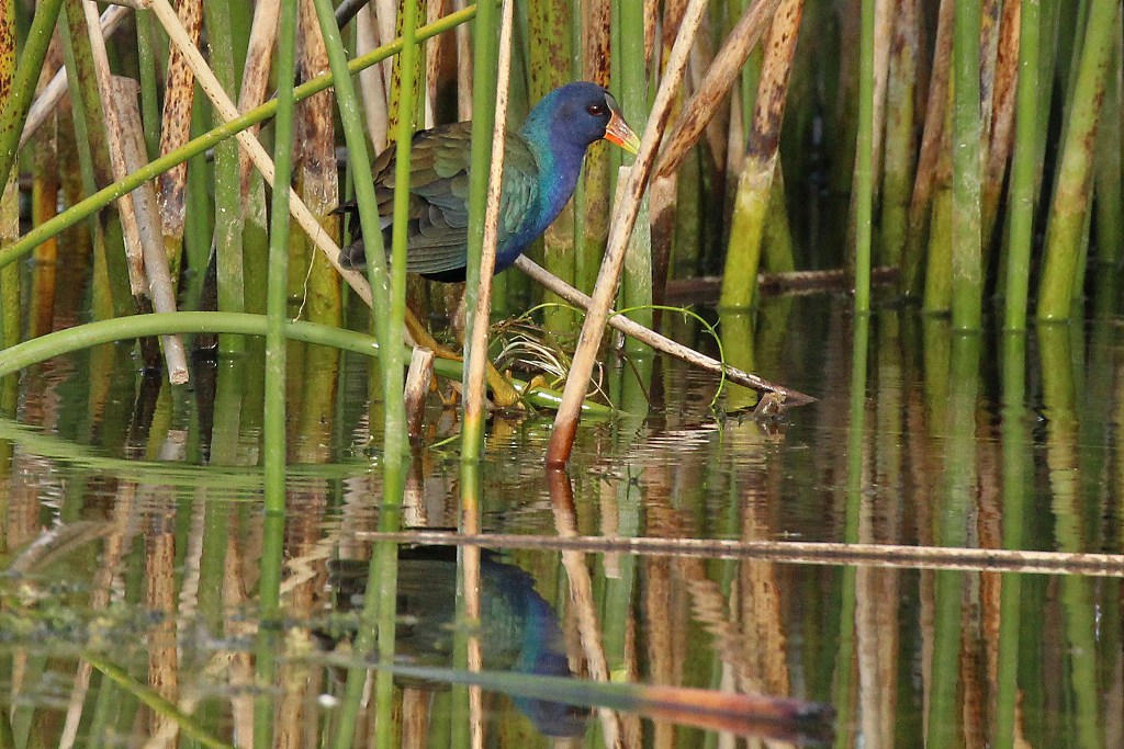 During our visit to the Orlando Wetlands, Rick (aka sexy camera caddie!) and I went down a trail that was a peninsula between two marshes. As we approached the end, a blur of purple and green caught my eye before it disappeared into the reeds. Rather than continuing on our way, we opted to camp out for a bit and wait to see if this bird of many colors would bless us with its appearance.