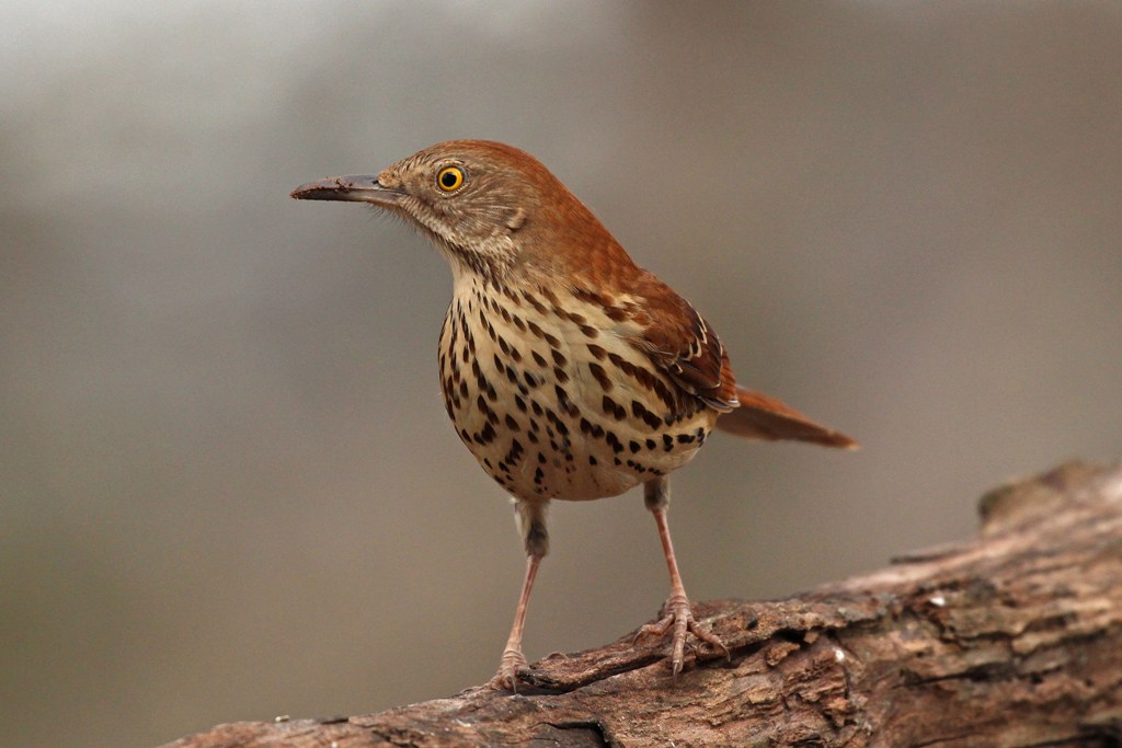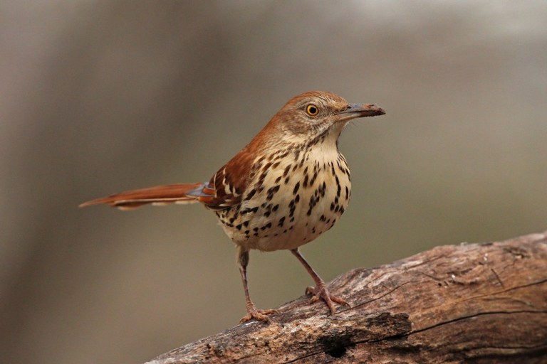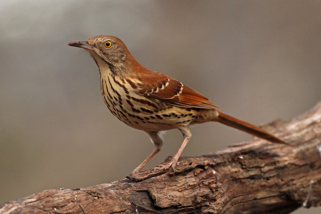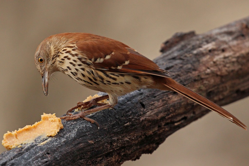 The Brown Thrasher, though similar in color tones, is not similar in temperament!
