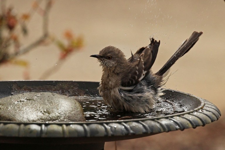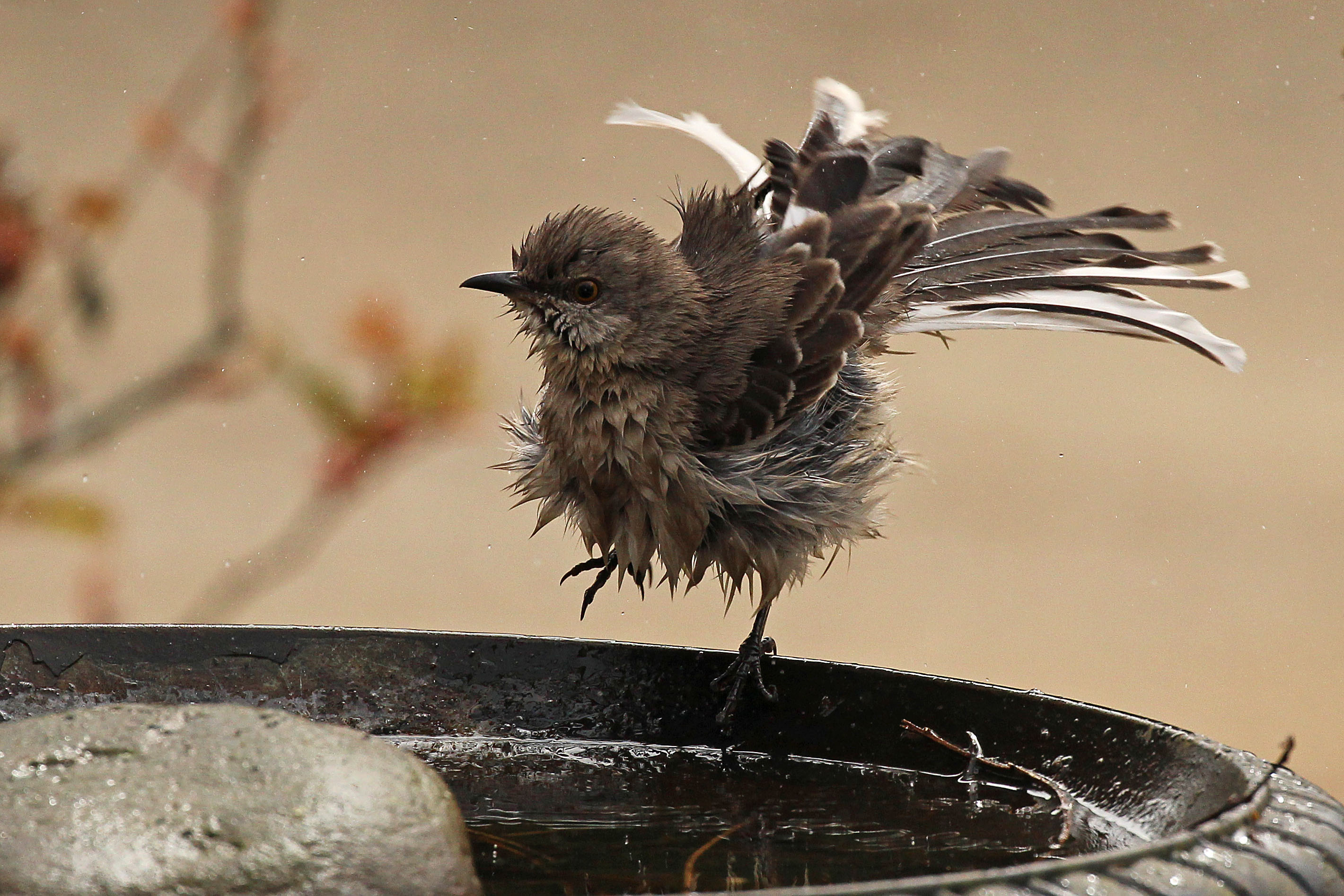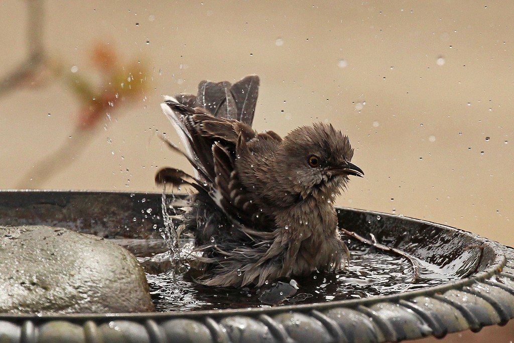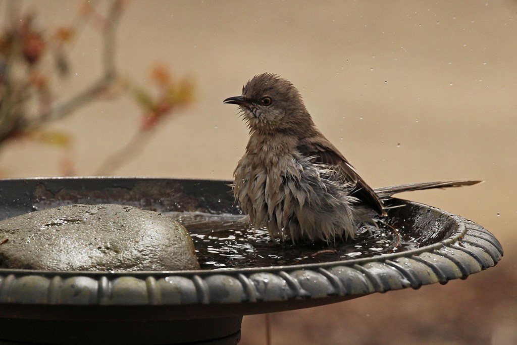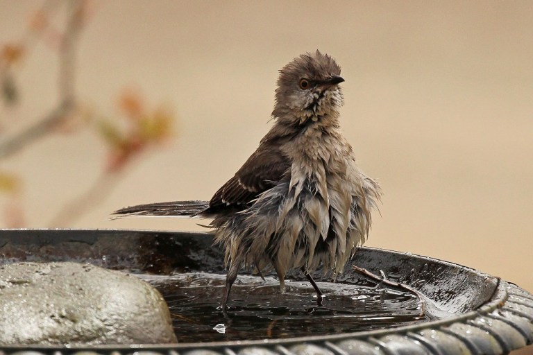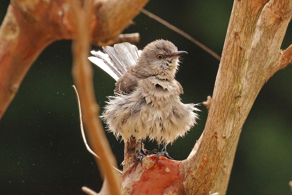 After one of our (many) recent rain showers, I saw this slightly disheveled Mockingbird perched on the side of the front yard birdbath. Evidently, he had already sampled the water and found it satisfactory because he opted to hop back in.