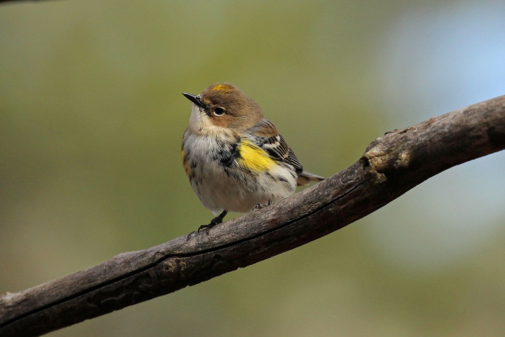 …a Yellow-rumped Warbler darts down and dive bombs him off the branch.