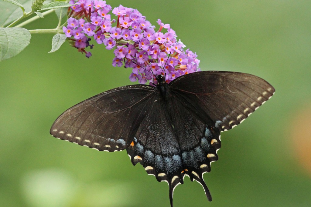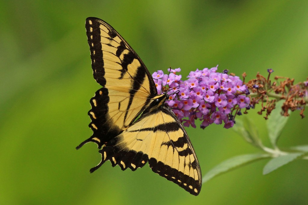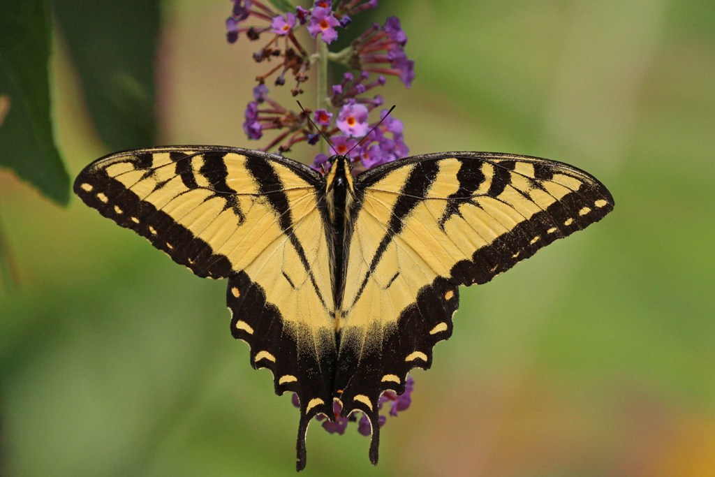 Butterflies, though later than usual, are sampling the purple blossoms from the bush that bears their name – like this male Tiger Swallowtail…
