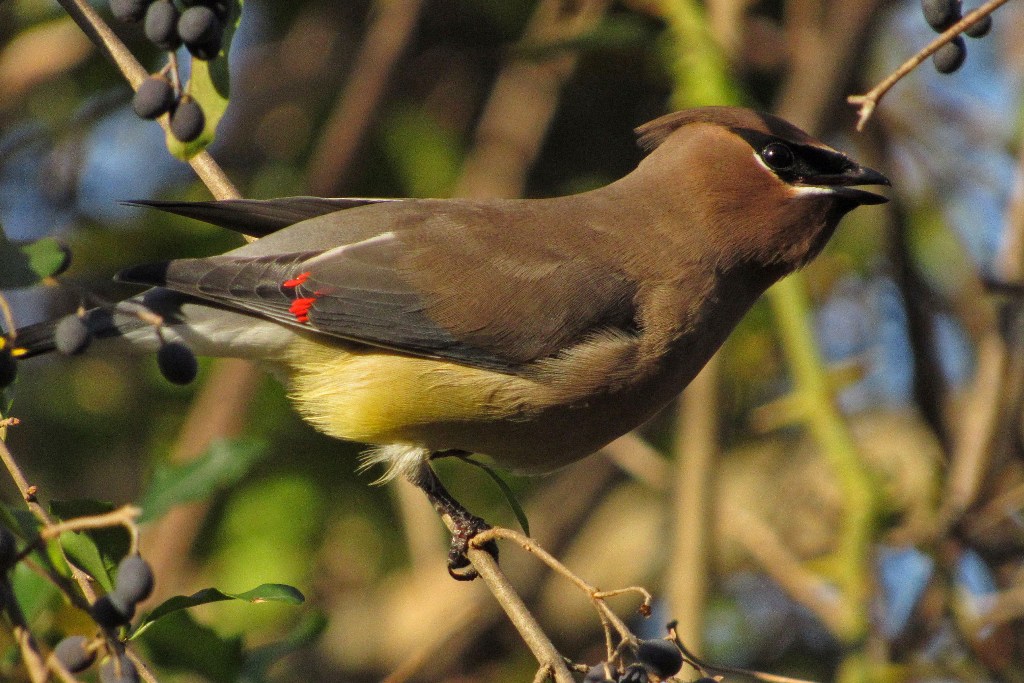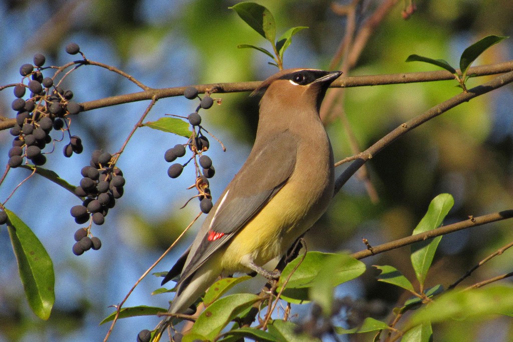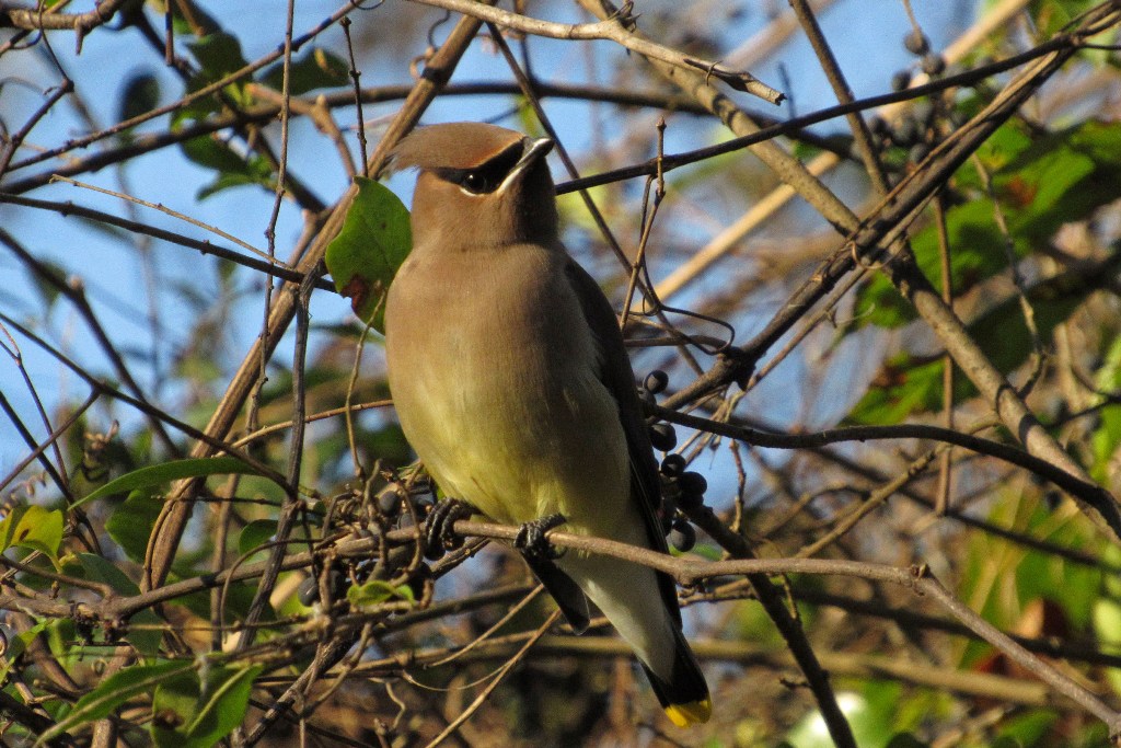 Yesterday, while out on one of these meandering journeys, travelling alongside a trickling creek (which is a symphony in itself!) I heard a high pitch whistle and saw a rustling in a bush just off the path. Much to my delight, I discovered a band of Cedar Waxwings busy absconding berries.