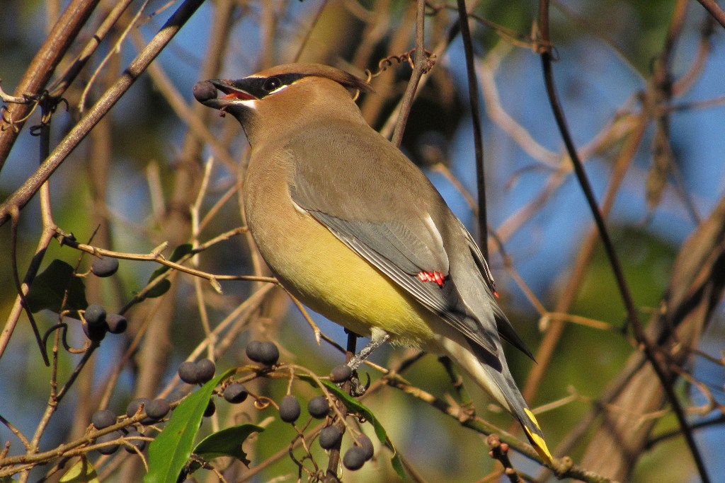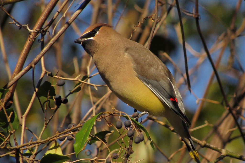 All throughout the bush, other Waxwings were engaged in this same berry devouring process.