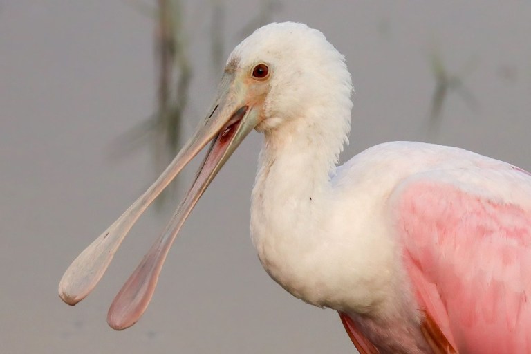 Spoonbills use their bills to sift through the muck and find food (more by feel than by sight) and have toes with claws (rather than webbed feet) that help them grip the slick bottom of the lake or marsh.