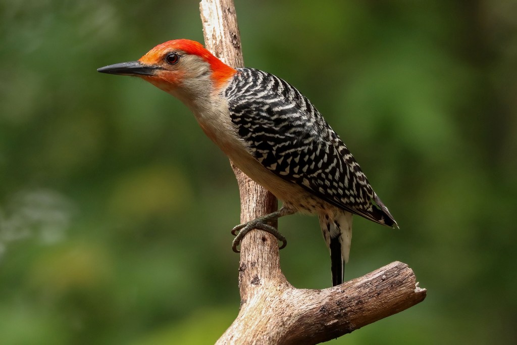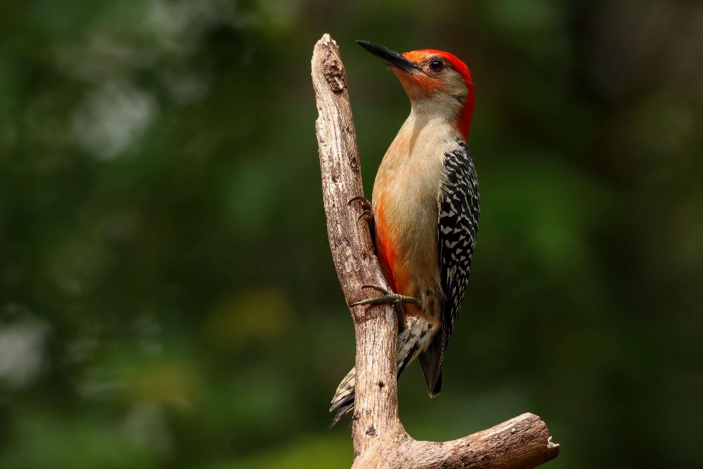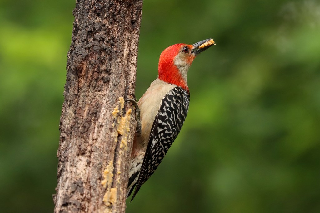 You can see in the picture below why he is called a “Red-bellied” Woodpecker, and you can see from the appearance of his foe that the name “Red-head” already belonged to one for whom it was better suited.