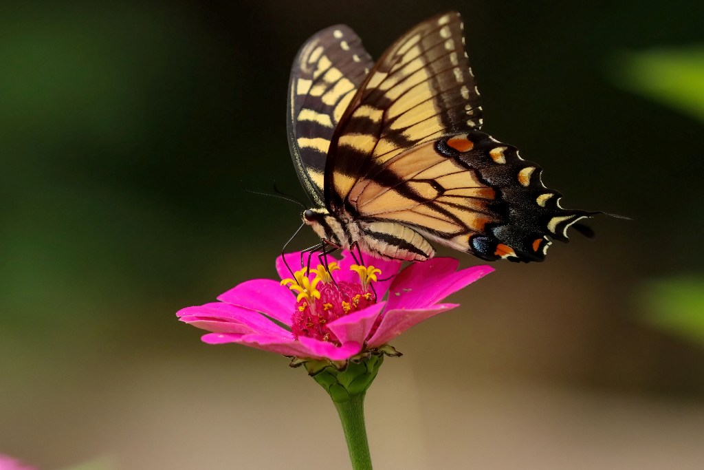 I noticed a lovely female Tiger Swallowtail flitting about in the front yard yesterday, mostly sipping from the Zinnias.