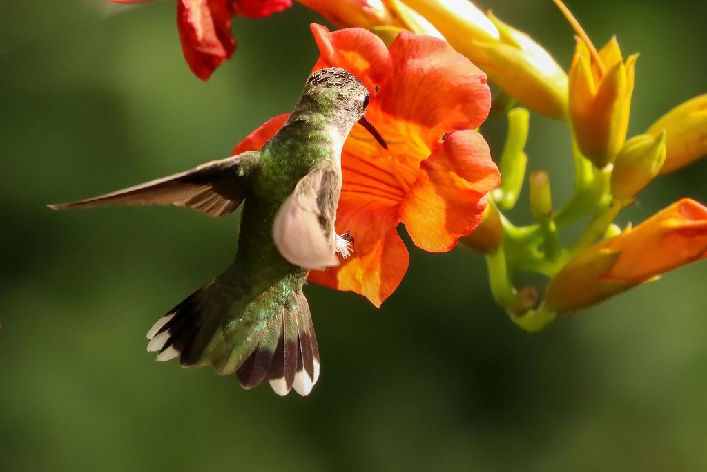 …as well as this Ruby-throated Hummingbird, who was intent on investigating the Trumpet Vine.